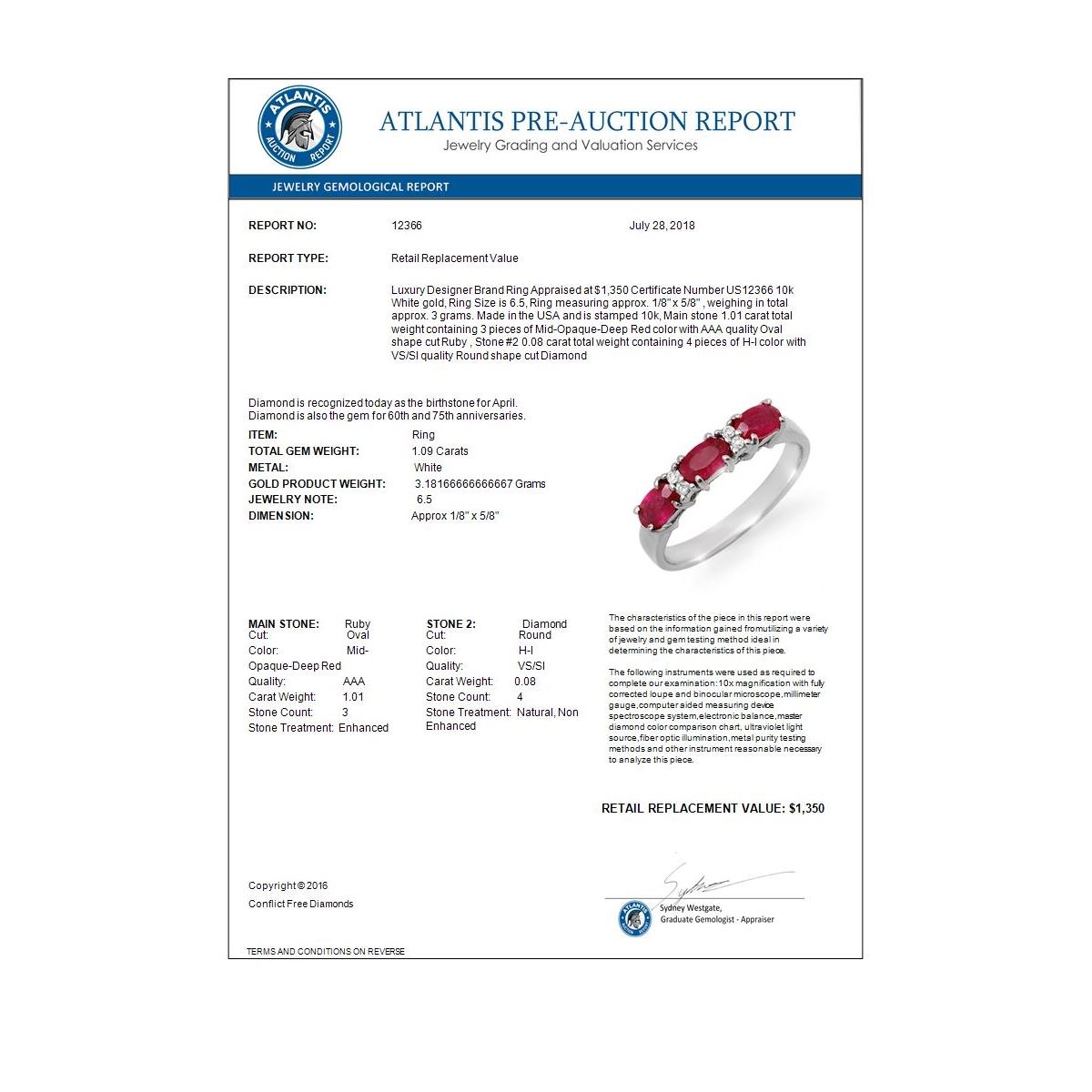 REF-20A5X -12366 ---- 1.09 CTW Ruby & Diamond Ring 10K White Gold ---- Luxury Designer Brand Ring Appraised at $1,350 Certificate Number US12366 10k White gold, Ring Size is 6.5, Ring measuring approx. 1/8" x 5/8" , weighing in total approx. 3 grams. Made in the USA and is stamped 10k, Main stone 1.01 carat total weight containing 3 pieces of Mid-Opaque-Deep Red color with AAA quality Oval shape cut Ruby , Stone #2 0.08 carat total weight containing 4 pieces of H-I color with VS/SI quality Round shape cut Diamond