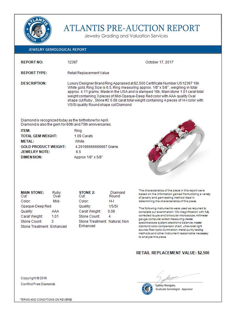 12367 - REF-38F2N ---- 1.09 CTW Ruby & Diamond Ring 18K White Gold ---- Luxury Designer Brand Ring Appraised at $2,500 Certificate Number US12367 18k White gold, Ring Size is 6.5, Ring measuring approx. 1/8" x 5/8" , weighing in total approx. 4.11 grams. Made in the USA and is stamped 18k, Main stone 1.01 carat total weight containing 3 pieces of Mid-Opaque-Deep Red color with AAA quality Oval shape cut Ruby , Stone #2 0.08 carat total weight containing 4 pieces of H-I color with VS/SI quality Round shape cut Diamond