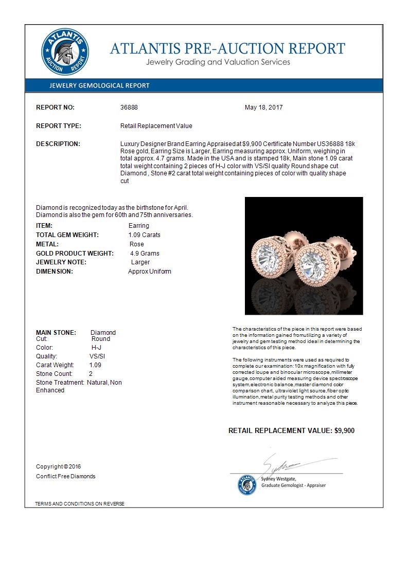 1.09 CTW VS/SI Diamond Solitaire Art Deco Stud Earrings 18K Rose Gold ---- Luxury Designer Brand Earring Appraised Retail Price at $9,900 ---- SKU Number US36888 18k Rose gold Earring Size is Larger, Earring measuring approx. Uniform, weighing in total approx. 4.7 grams. Made in the USA and is stamped 18k, Main stone 1.09 carat total weight containing 2 pieces of H-J color with VS/SI quality Round shape cut Diamond , Stone #2 carat total weight containing pieces of color with quality shape cut
