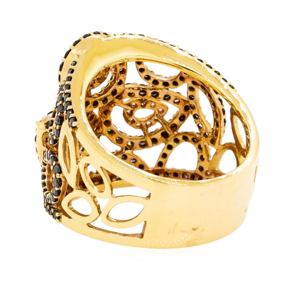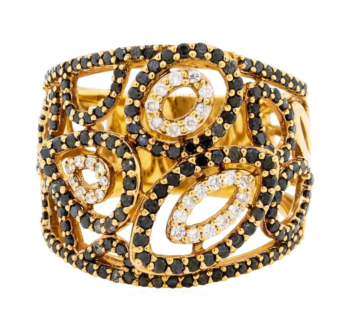 One electronically tested 18KT yellow gold lady's cast fashion ring with a tapered wide band with a bright polish finish. The featured lady's ring has a black and white diamond floral motif and a shank measuring 8.00 millimeters wide. Identified with markings of '18K 750'. Condition is new, good workmanship. Containing: One Hundred Seventy-Two prong set round brilliant cut diamonds, measuring 1.15 - 1.10 x 0.70mm (depth est.) approximate total weight of 172 Stones = 0.93ct. Graded in the setting. Color Fancy Black Cut Good Thirty prong set round brilliant cut diamonds, measuring 1.15 - 1.10 x 0.70mm (depth est.) approximate total weight of 30 Stones = 0.16ct. Graded in the setting. Color H - I Clarity SI-2 to I-1 Cut Good. Total Weight of Diamonds 1.09ct.. Total Weight of Ring 8.30gm GAS Appraised at $4785.00. GAS Appraised at $4,785.00.