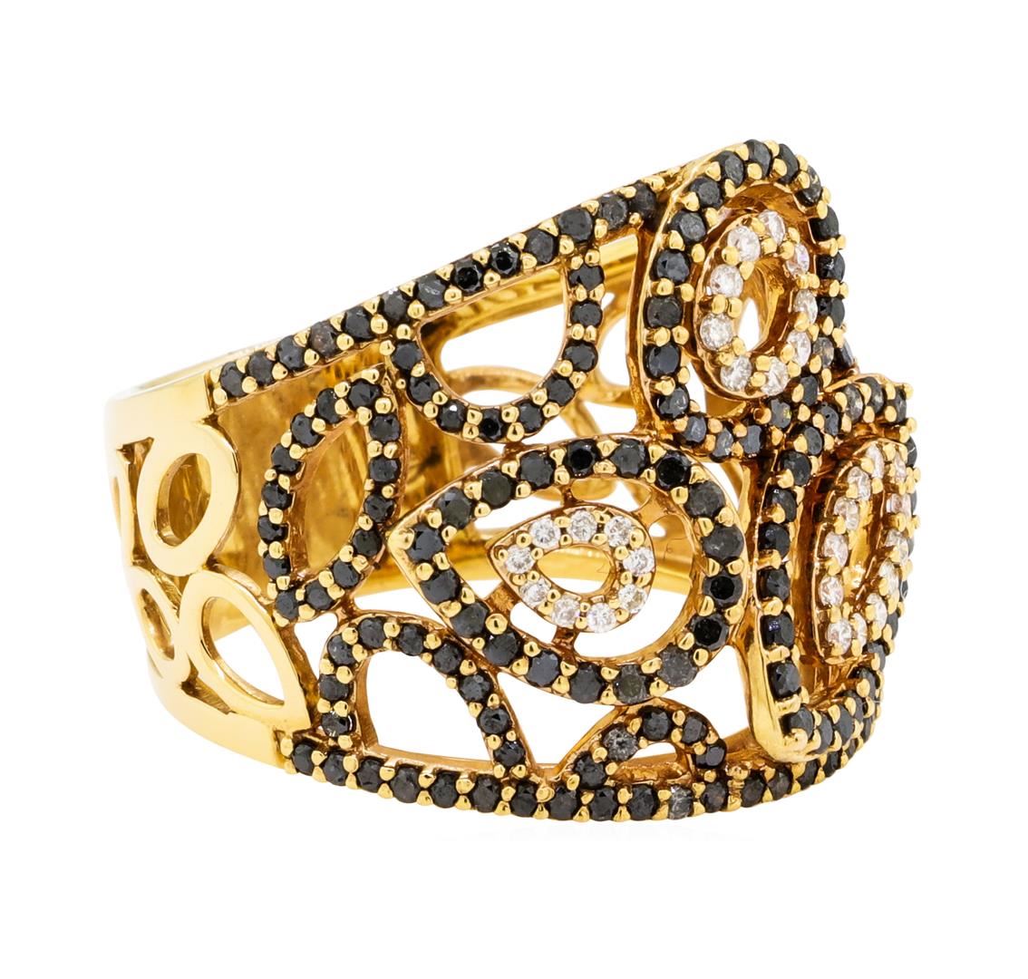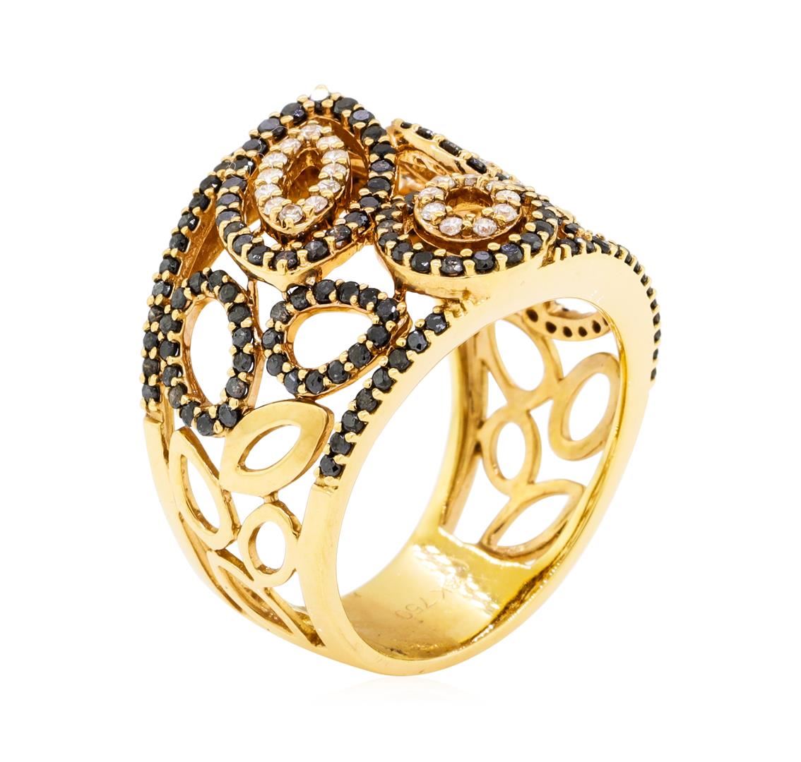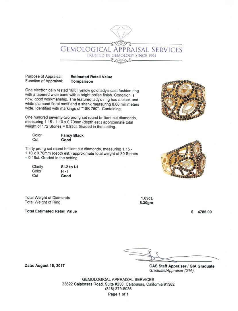 One electronically tested 18KT yellow gold lady's cast fashion ring with a tapered wide band with a bright polish finish. The featured lady's ring has a black and white diamond floral motif and a shank measuring 8.00 millimeters wide. Identified with markings of '18K 750'. Condition is new, good workmanship. Containing: One Hundred Seventy-Two prong set round brilliant cut diamonds, measuring 1.15 - 1.10 x 0.70mm (depth est.) approximate total weight of 172 Stones = 0.93ct. Graded in the setting. Color Fancy Black Cut Good Thirty prong set round brilliant cut diamonds, measuring 1.15 - 1.10 x 0.70mm (depth est.) approximate total weight of 30 Stones = 0.16ct. Graded in the setting. Color H - I Clarity SI-2 to I-1 Cut Good. Total Weight of Diamonds 1.09ct.. Total Weight of Ring 8.30gm GAS Appraised at $4785.00. GAS Appraised at $4,785.00.