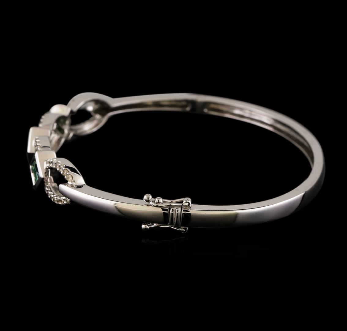 One electronically tested 14KT white gold ladies cast & assembled diamond bangle bracelet. Six and one-half inch wearable length bangle bracelet features a series of three green diamond stations set between diamond ribbon ovals. The bracelet tapers from eight millimeters to three millimeters wide, supported by hinged shoulders, terminating in a concealed clasp with twin safeties. Bright polish finish. Identified with markings of '14K'. Condition is good. Containing: Twelve invisible set princess cut diamonds, measuring 2.10 x 2.00 x 1.50mm (depth est.) approximate total weight of 12 Stones = 0.64ct. Indications of laboratory irradiated enhanced color. Graded in the setting. Clarity SI-2 to I-2 Fifty-Six prong set round brilliant cut diamonds, measuring 1.30 - 1.20 x 0.75mm (depth est.) approximate total weight of 56 Stones = 0.45ct. Graded in the setting. Clarity I-1 to I-2. Color: G - I. Total Weight of Diamonds 1.09ct.. Total Weight of Bracelet 13.27gm. AIG Appraised at $4,375.00.