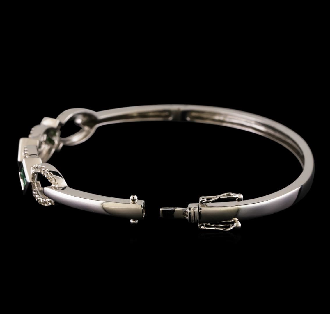 One electronically tested 14KT white gold ladies cast & assembled diamond bangle bracelet. Six and one-half inch wearable length bangle bracelet features a series of three green diamond stations set between diamond ribbon ovals. The bracelet tapers from eight millimeters to three millimeters wide, supported by hinged shoulders, terminating in a concealed clasp with twin safeties. Bright polish finish. Identified with markings of '14K'. Condition is good. Containing: Twelve invisible set princess cut diamonds, measuring 2.10 x 2.00 x 1.50mm (depth est.) approximate total weight of 12 Stones = 0.64ct. Indications of laboratory irradiated enhanced color. Graded in the setting. Clarity SI-2 to I-2 Fifty-Six prong set round brilliant cut diamonds, measuring 1.30 - 1.20 x 0.75mm (depth est.) approximate total weight of 56 Stones = 0.45ct. Graded in the setting. Clarity I-1 to I-2. Color: G - I. Total Weight of Diamonds 1.09ct.. Total Weight of Bracelet 13.27gm. AIG Appraised at $4,375.00.