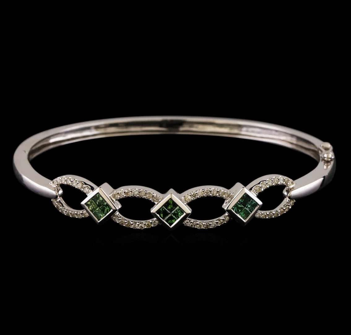 One electronically tested 14KT white gold ladies cast & assembled diamond bangle bracelet. Six and one-half inch wearable length bangle bracelet features a series of three green diamond stations set between diamond ribbon ovals. The bracelet tapers from eight millimeters to three millimeters wide, supported by hinged shoulders, terminating in a concealed clasp with twin safeties. Bright polish finish. Identified with markings of '14K'. Condition is good. Containing: Twelve invisible set princess cut diamonds, measuring 2.10 x 2.00 x 1.50mm (depth est.) approximate total weight of 12 Stones = 0.64ct. Indications of laboratory irradiated enhanced color. Graded in the setting. Clarity SI-2 to I-2 Fifty-Six prong set round brilliant cut diamonds, measuring 1.30 - 1.20 x 0.75mm (depth est.) approximate total weight of 56 Stones = 0.45ct. Graded in the setting. Clarity I-1 to I-2. Color: G - I. Total Weight of Diamonds 1.09ct.. Total Weight of Bracelet 13.27gm. AIG Appraised.