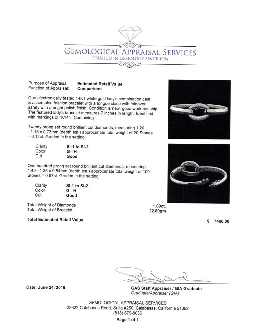 One electronically tested 14KT white gold lady's combination cast & assembled fashion bracelet with a tongue clasp with foldover safety with a bright polish finish. The featured lady's bracelet measures 7 inches in length. Identified with markings of "K14". Condition is new, good workmanship. Containing: Twenty prong set round brilliant cut diamonds, measuring 1.20 - 1.15 x 0.73mm (depth est.) approximate total weight of 20 Stones = 0.12ct. Graded in the setting. Clarity: SI-1 to SI-2. Color: G - Good One Hundred prong set round brilliant cut diamonds, measuring 1.40 - 1.35 x 0.84mm (depth est.) approximate total weight of 100 Stones = 0.97ct. Graded in the setting. Clarity: SI-1 to SI-2. Color: G - Good. Total Weight of Diamonds 1.09ct. Total Weight of Bracelet 22.80gm.