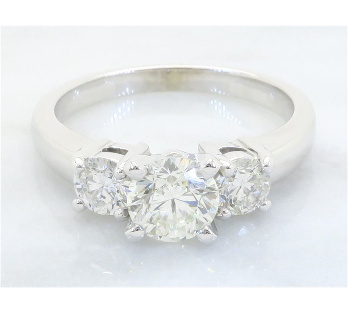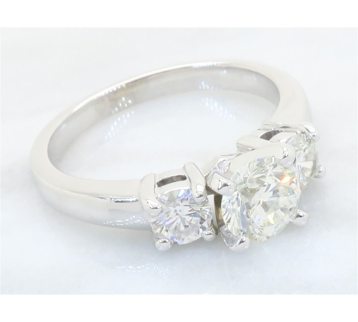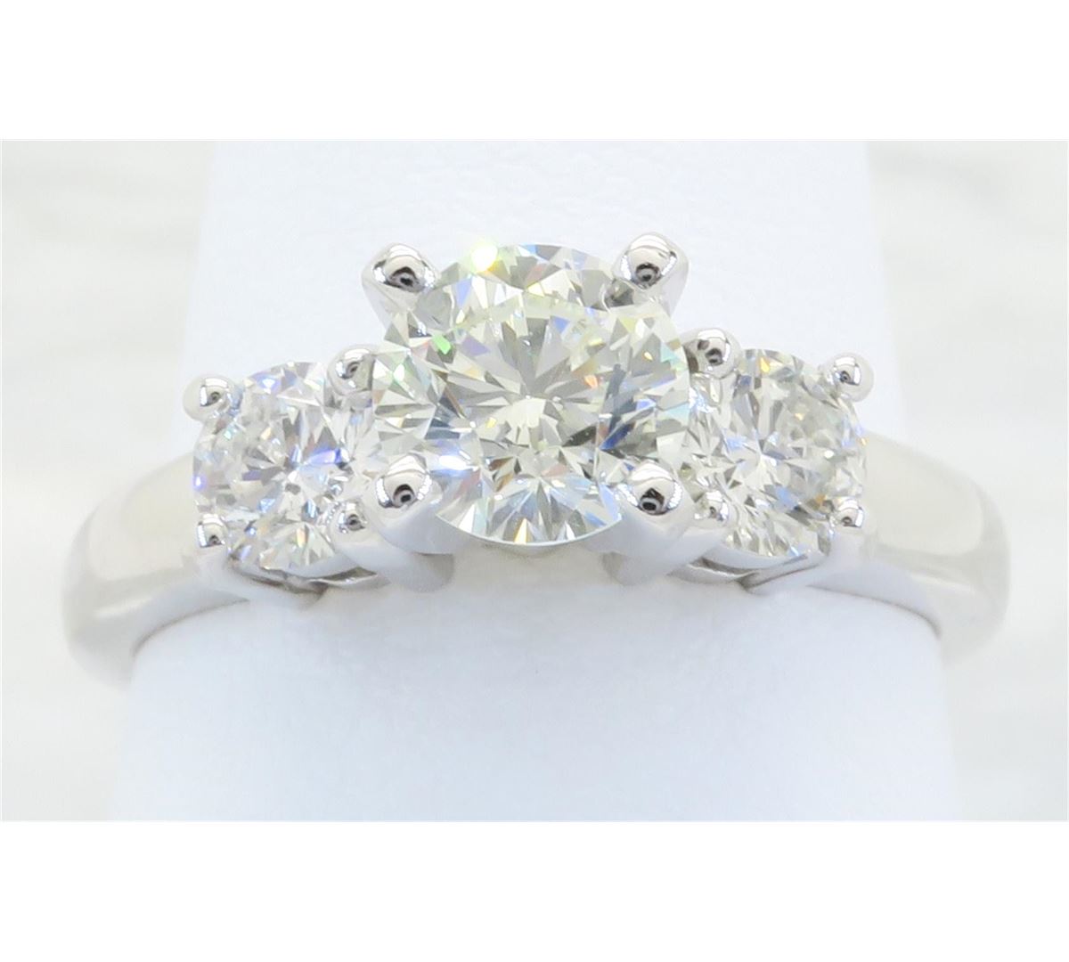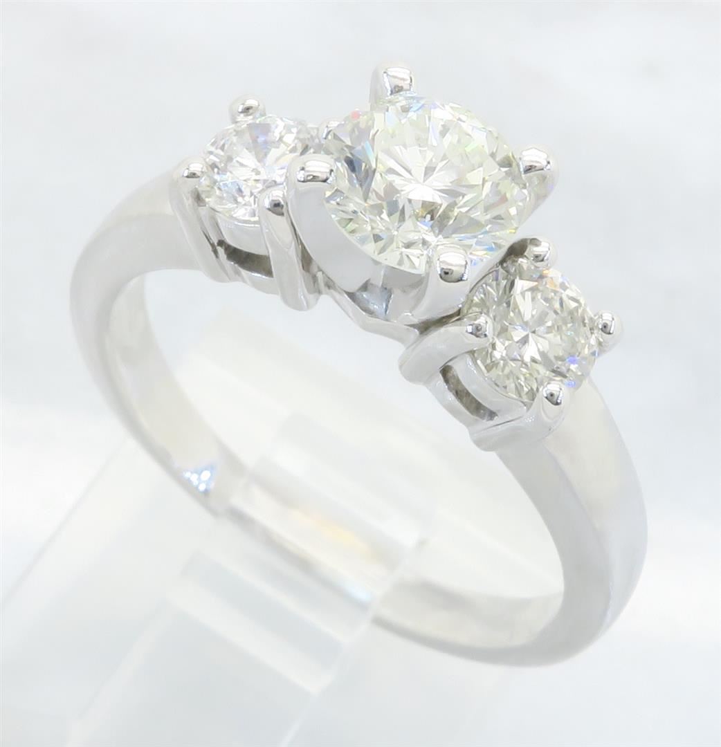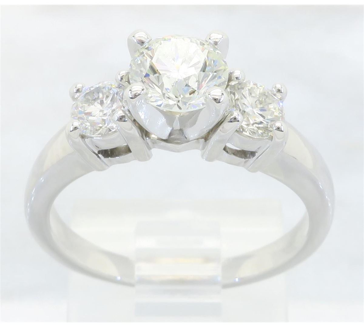 One tested 14K white gold diamond ring. Containing: One Round Brilliant Cut Diamond. Approximate Size: .65CT, Clarity: SI1, Color: J-K. Two Round Brilliant Cut Diamonds. Approximate total diamond weight: 1.09CTW. All diamonds are graded in the mounting unless otherwise stated. Weight of ring: 4.0 grams, Size: 6.25.