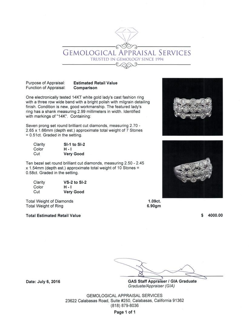 One electronically tested 14KT white gold lady's cast fashion ring with a three row wide band with a bright polish with milgrain detailing finish. The featured lady's ring has a shank measuring 2.99 millimeters in width. Identified with markings of '14K'. Condition is new, good workmanship. Containing: Seven prong set round brilliant cut diamonds, measuring 2.70 - 2.65 x 1.66mm (depth est.) approximate total weight of 7 Stones = 0.51ct. Graded in the setting. Clarity SI-1 to SI-2. Color: H - I Cut Very Good Ten bezel set round brilliant cut diamonds, measuring 2.50 - 2.45 x 1.54mm (depth est.) approximate total weight of 10 Stones = 0.58ct. Graded in the setting. Clarity VS-2 to SI-2. Color: H - I Cut Very Good. Total Weight of Diamonds 1.09ct.. Total Weight of Ring 6.90gm. GAS Appraised at $4,000.00.