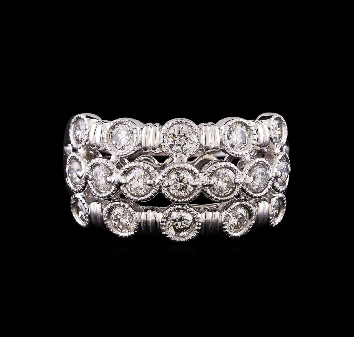 One electronically tested 14KT white gold lady's cast fashion ring with a three row wide band with a bright polish with milgrain detailing finish. The featured lady's ring has a shank measuring 2.99 millimeters in width. Identified with markings of '14K'. Condition is new, good workmanship. Containing: Seven prong set round brilliant cut diamonds, measuring 2.70 - 2.65 x 1.66mm (depth est.) approximate total weight of 7 Stones = 0.51ct. Graded in the setting. Clarity SI-1 to SI-2. Color: H - I Cut Very Good Ten bezel set round brilliant cut diamonds, measuring 2.50 - 2.45 x 1.54mm (depth est.) approximate total weight of 10 Stones = 0.58ct. Graded in the setting. Clarity VS-2 to SI-2. Color: H - I Cut Very Good. Total Weight of Diamonds 1.09ct.. Total Weight of Ring 6.90gm. GAS Appraised at $4,000.00.