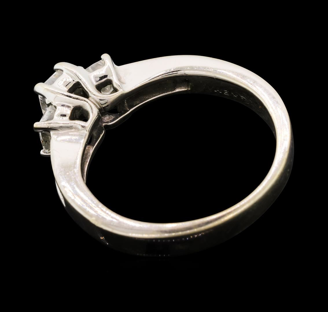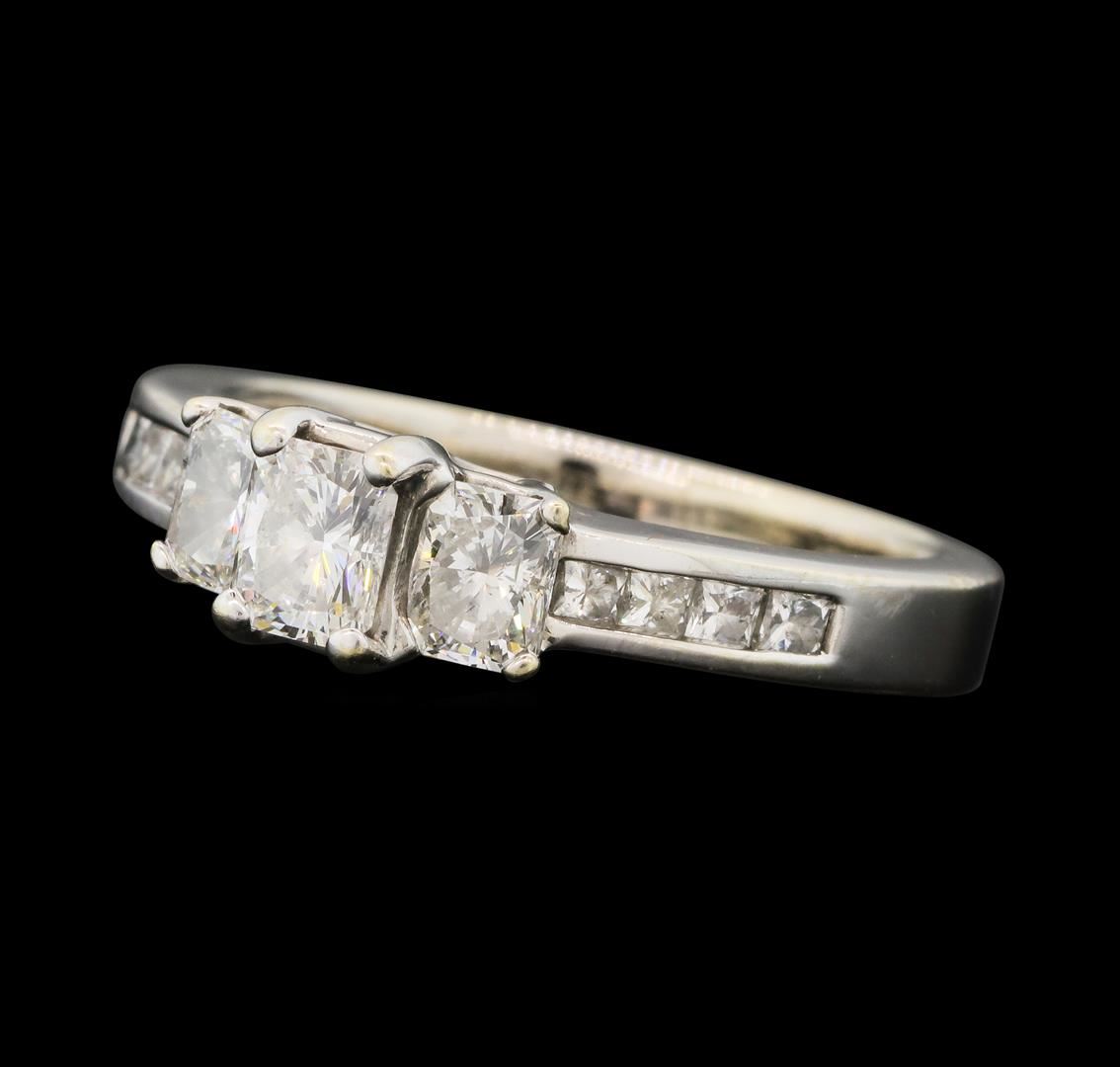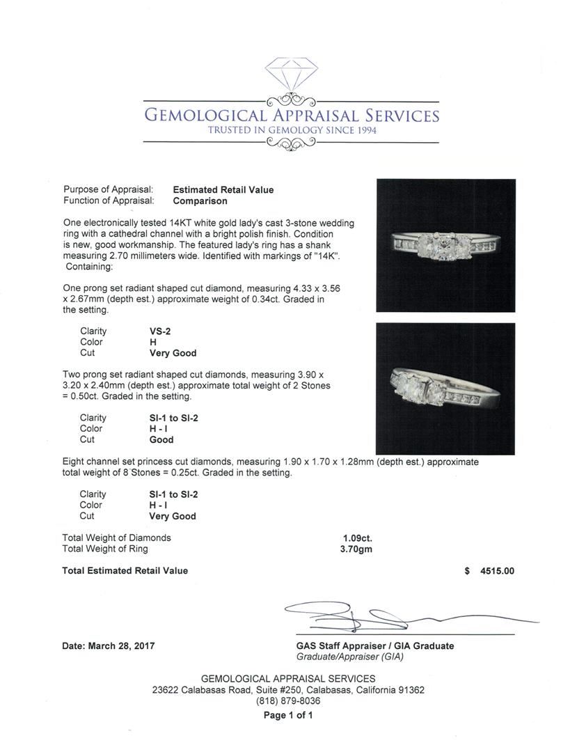 One electronically tested 14KT white gold lady's cast 3-stone wedding ring with a cathedral channel with a bright polish finish. The featured lady's ring has a shank measuring 2.70 millimeters wide. Identified with markings of '14K'. Condition is new, goo GAS Appraised at $4,515.00.
