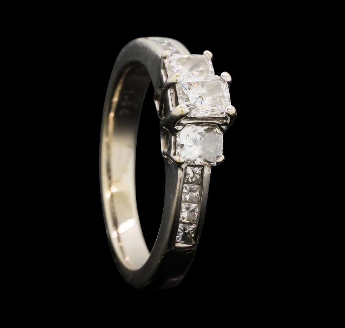 One electronically tested 14KT white gold lady's cast 3-stone wedding ring with a cathedral channel with a bright polish finish. The featured lady's ring has a shank measuring 2.70 millimeters wide. Identified with markings of '14K'. Condition is new, goo GAS Appraised at $4,515.00.