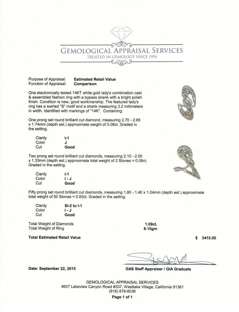 One electronically tested 14KT white gold lady's combination cast & assembled fashion ring with a bypass shank with a bright polish finish. The featured lady's ring has a swirled "S" motif and a shank measuring 3.2 millimeters in width. Identified with markings of "14K". Condition is new, good workmanship. Containing: One prong set round brilliant cut diamond, measuring 2.70 - 2.65 x 1.74mm (depth est.) approximate weight of 0.08ct. Graded in the setting. Clarity: I-1. Color: Good Two prong set round brilliant cut diamonds, measuring 2.10 - 2.00 x 1.33mm (depth est.) approximate total weight of 2 Stones = 0.08ct. Graded in the setting. Clarity: I-1. Color: I - Good Fifty prong set round brilliant cut diamonds, measuring 1.80 - 1.40 x 1.04mm (depth est.) approximate total weight of 50 Stones = 0.93ct. Graded in the setting. Clarity: SI-2 to I-1. Color: I - Good. Total Weight of Diamonds 1.09ct. Total Weight of Ring 8.10gm at $3410.00.. GAS Appraised.