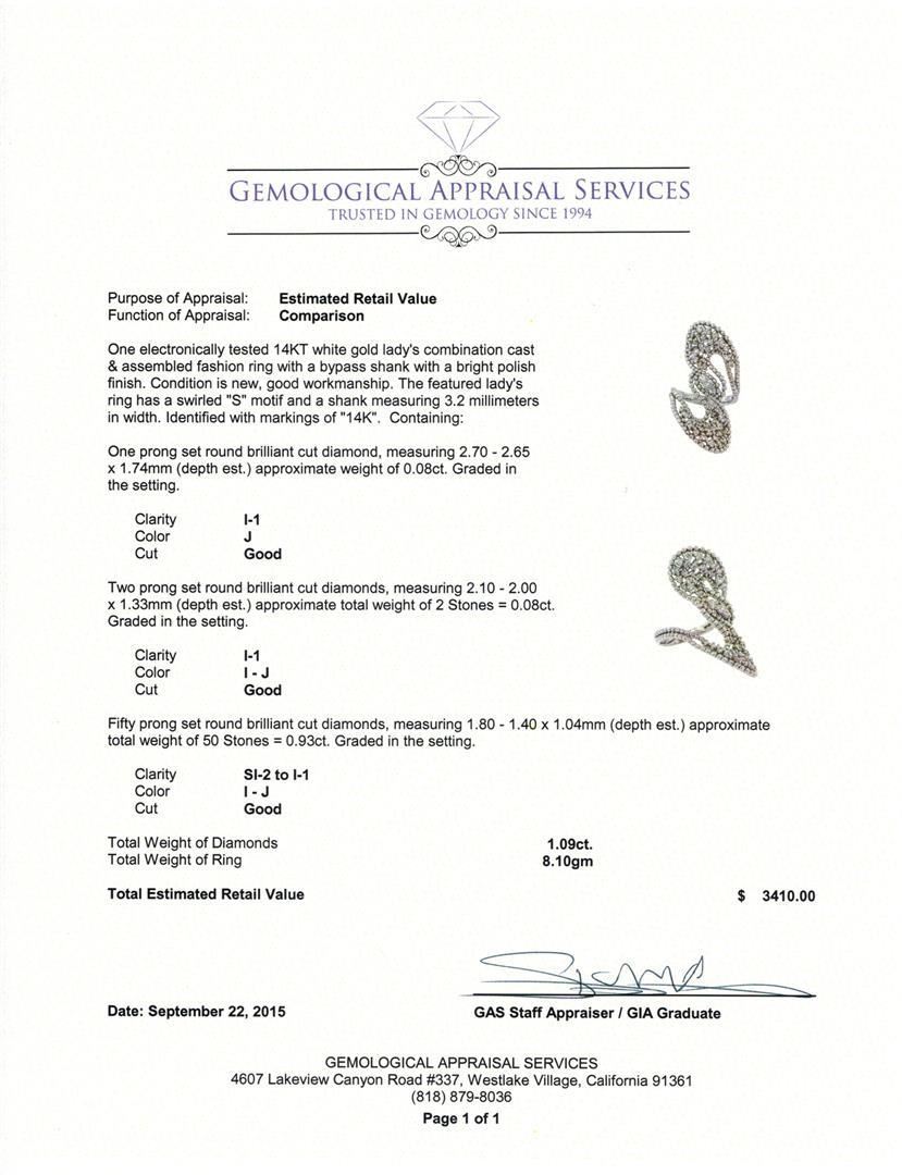 One electronically tested 14KT white gold lady's combination cast & assembled fashion ring with a bypass shank with a bright polish finish. The featured lady's ring has a swirled "S" motif and a shank measuring 3.2 millimeters in width. Identified with markings of "14K". Condition is new, good workmanship. Containing: One prong set round brilliant cut diamond, measuring 2.70 - 2.65 x 1.74mm (depth est.) approximate weight of 0.08ct. Graded in the setting. Clarity: I-1. Color: Good Two prong set round brilliant cut diamonds, measuring 2.10 - 2.00 x 1.33mm (depth est.) approximate total weight of 2 Stones = 0.08ct. Graded in the setting. Clarity: I-1. Color: I - Good Fifty prong set round brilliant cut diamonds, measuring 1.80 - 1.40 x 1.04mm (depth est.) approximate total weight of 50 Stones = 0.93ct. Graded in the setting. Clarity: SI-2 to I-1. Color: I - Good. Total Weight of Diamonds 1.09ct. Total Weight of Ring 8.10gm at $3410.00.. GAS Appraised.