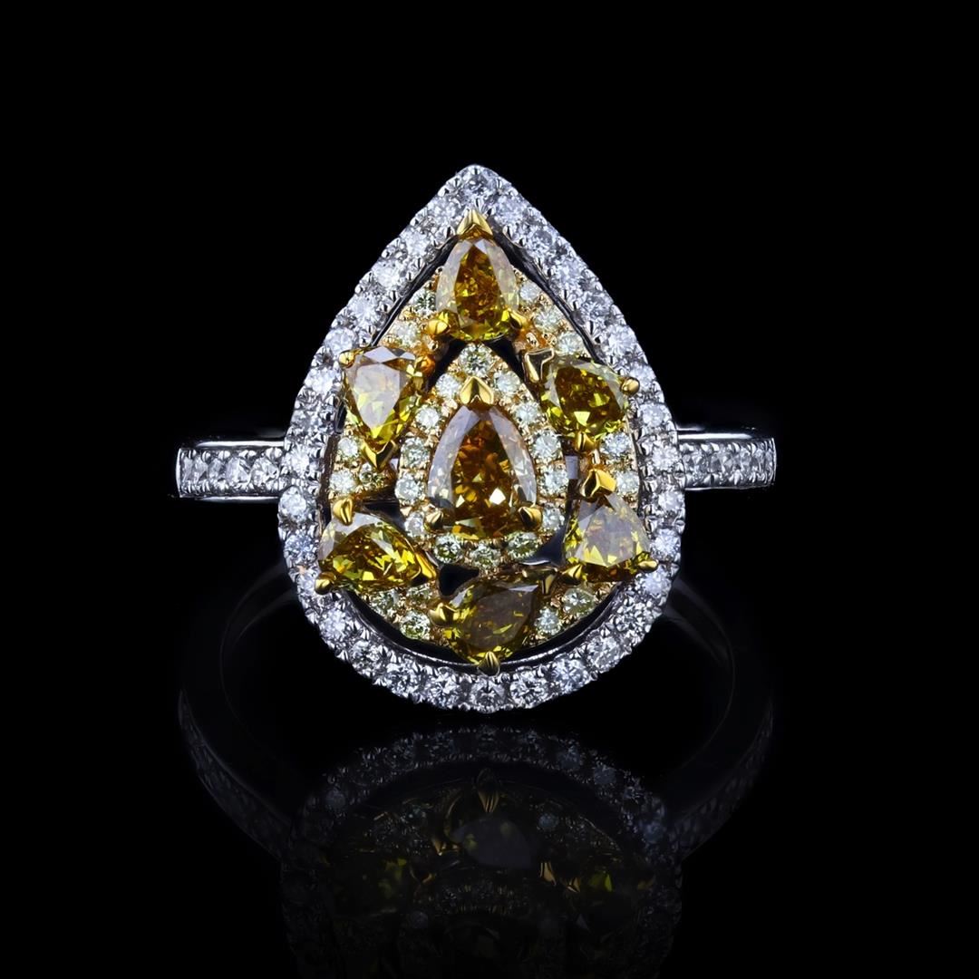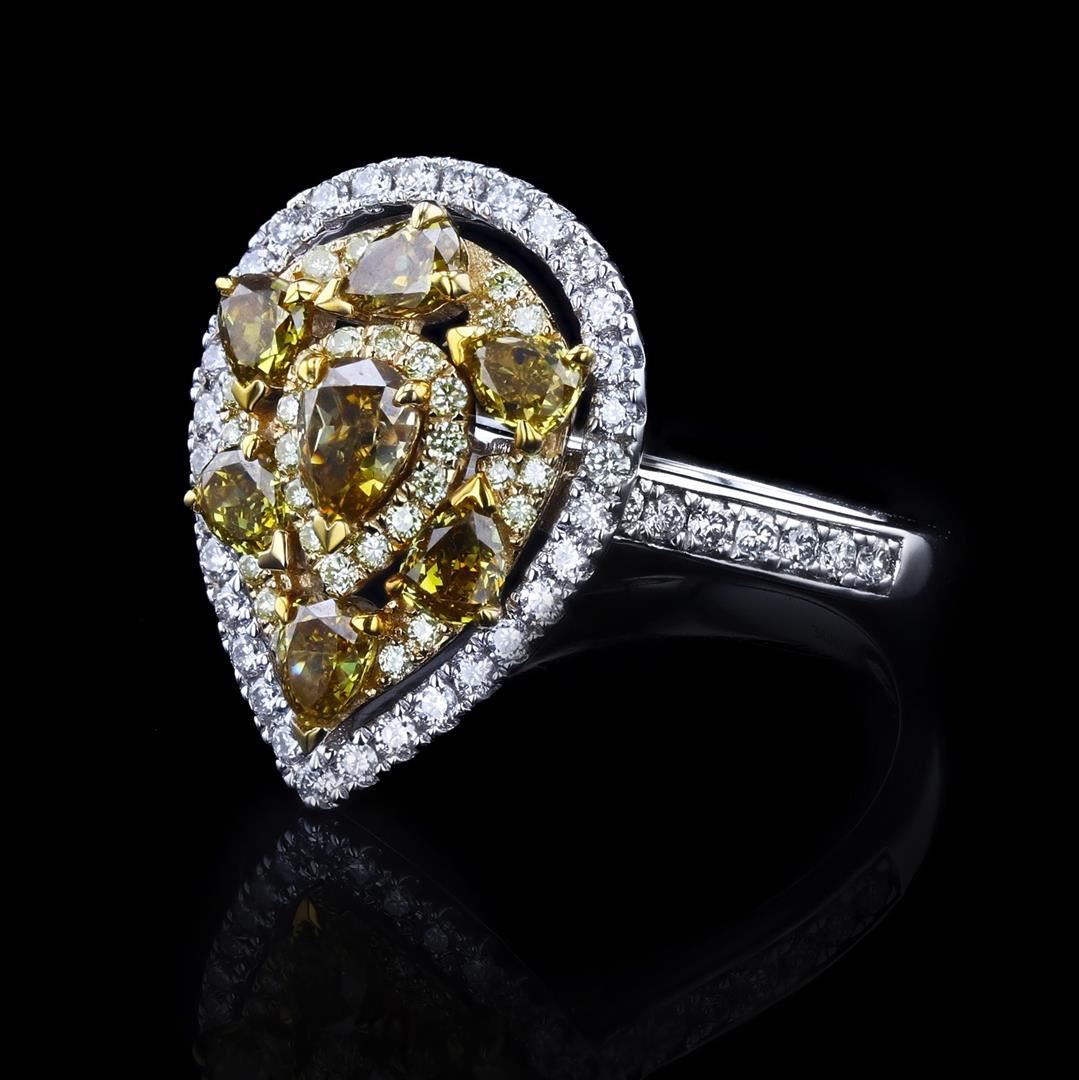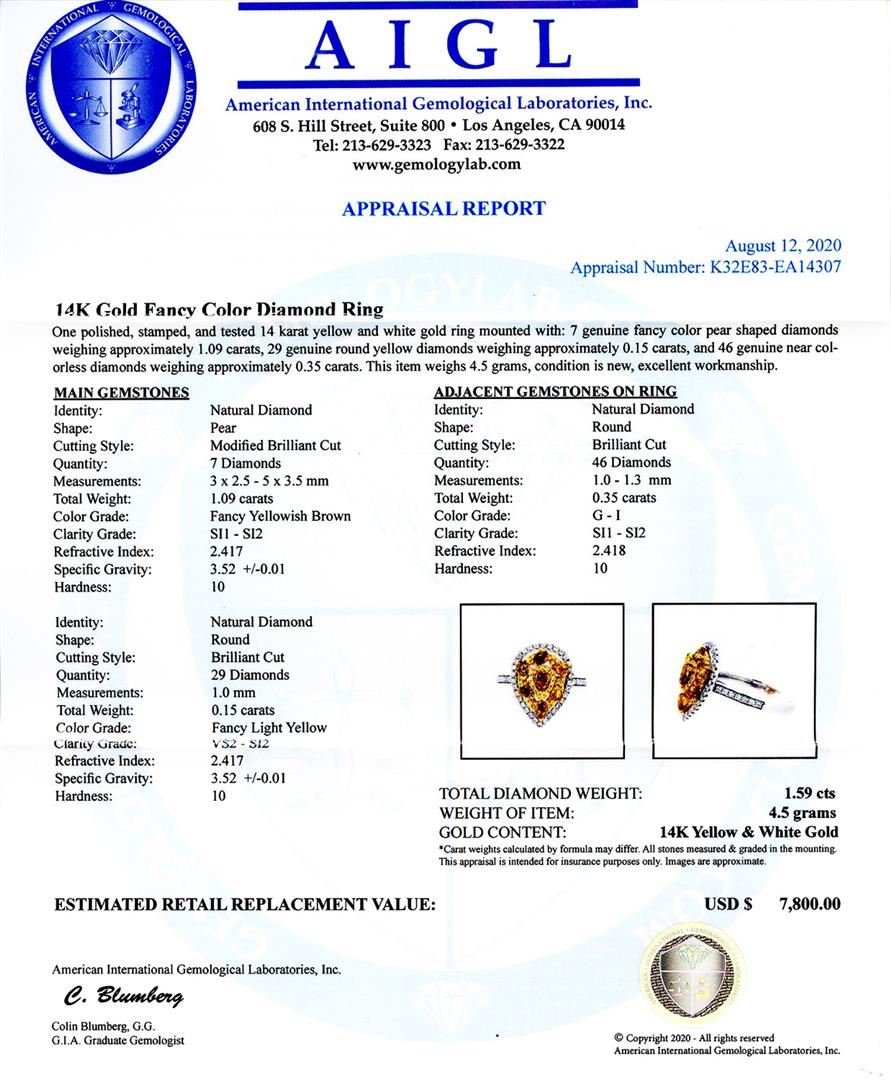1.09ctw Fancy Yellow Diamond 14K White Gold Ring (1.59ctw). Please see Photos and Description for all available information. This multicolored diamond ring features a 1.59ct fancy yellow diamond center stone set on a 14k white gold band. The color of the diamonds ranges from champagne to yellow and the clarity is SI2. The ring is size 7.
