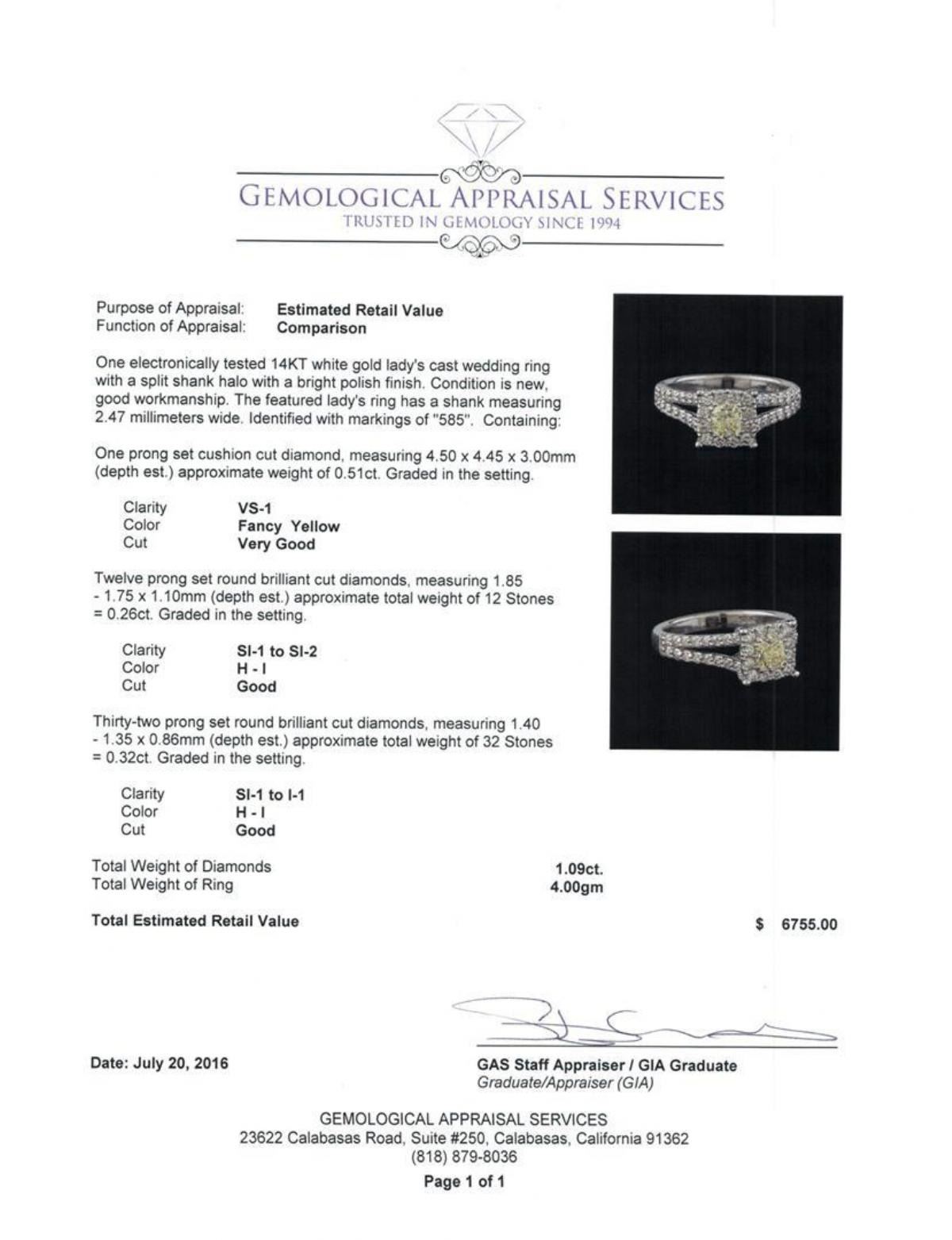 One electronically tested 14KT white gold lady's cast wedding ring with a split shank halo with a bright polish finish. The featured lady's ring has a shank measuring 2.47 millimeters wide. Identified with markings of '585'. Condition is new, good workmanship. Containing: One prong set cushion cut diamond, measuring 4.50 x 4.45 x 3.00mm (depth est.) approximate weight of 0.51ct. Graded in the setting. Clarity VS-1 Cut Very Good Twelve prong set round brilliant cut diamonds, measuring 1.85 - 1.75 x 1.10mm (depth est.) approximate total weight of 12 Stones = 0.26ct. Graded in the setting. Clarity SI-1 to SI-2. Color: H - I Cut Good Thirty-Two prong set round brilliant cut diamonds, measuring 1.40 - 1.35 x 0.86mm (depth est.) approximate total weight of 32 Stones = 0.32ct. Graded in the setting. Clarity SI-1 to I-1. Color: H - I Cut Good. Total Weight of Diamonds 1.09ct.. Total Weight of Ring 4.00gm. GAS Appraised.