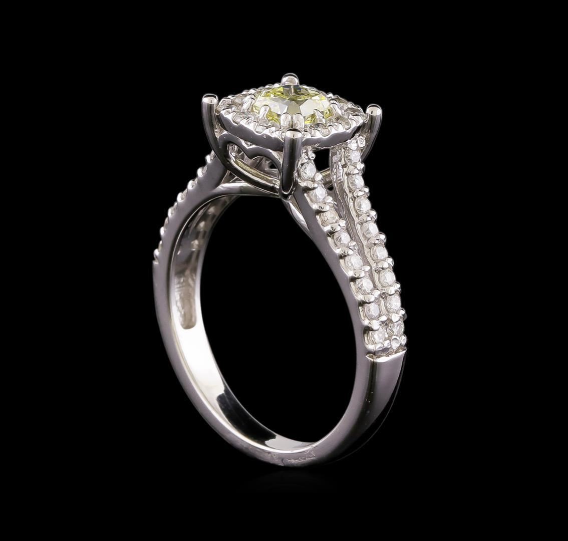 One electronically tested 14KT white gold lady's cast wedding ring with a split shank halo with a bright polish finish. The featured lady's ring has a shank measuring 2.47 millimeters wide. Identified with markings of '585'. Condition is new, good workmanship. Containing: One prong set cushion cut diamond, measuring 4.50 x 4.45 x 3.00mm (depth est.) approximate weight of 0.51ct. Graded in the setting. Clarity VS-1 Cut Very Good Twelve prong set round brilliant cut diamonds, measuring 1.85 - 1.75 x 1.10mm (depth est.) approximate total weight of 12 Stones = 0.26ct. Graded in the setting. Clarity SI-1 to SI-2. Color: H - I Cut Good Thirty-Two prong set round brilliant cut diamonds, measuring 1.40 - 1.35 x 0.86mm (depth est.) approximate total weight of 32 Stones = 0.32ct. Graded in the setting. Clarity SI-1 to I-1. Color: H - I Cut Good. Total Weight of Diamonds 1.09ct.. Total Weight of Ring 4.00gm. GAS Appraised.