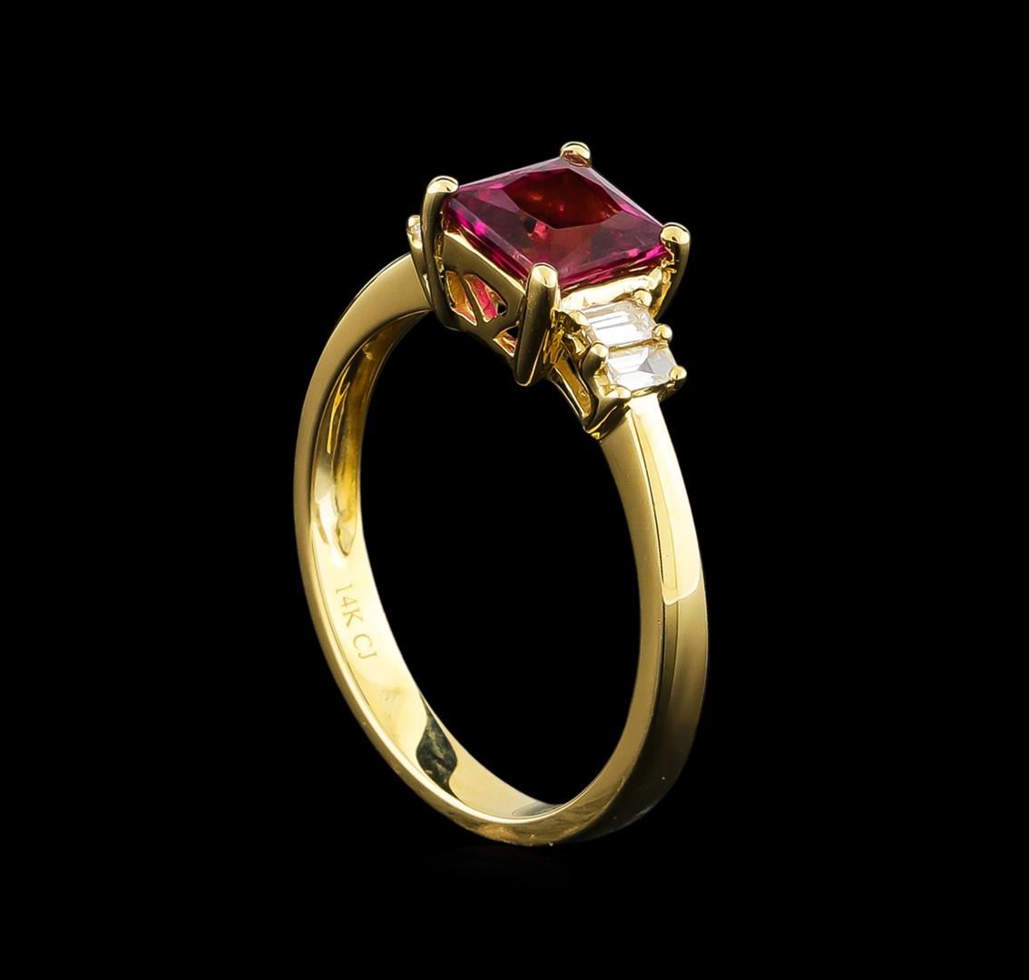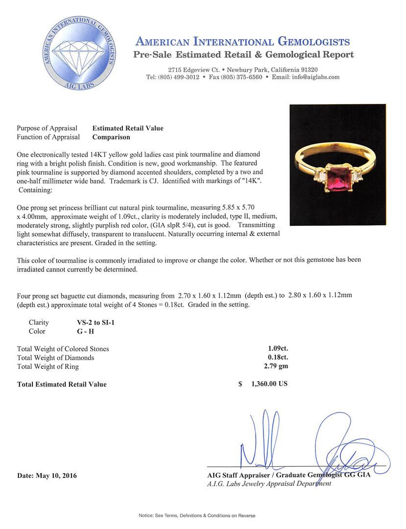 One electronically tested 14KT yellow gold ladies cast pink tourmaline and diamond ring with a bright polish finish. The featured pink tourmaline is supported by diamond accented shoulders, completed by a two and one-half millimeter wide band. Trademark is CJ. Identified with markings of "14K". Condition is new, good workmanship. Containing: One prong set princess brilliant cut natural pink tourmaline, measuring 5.85 x 5.70 x 4.00mm, approximate weight of 1.09ct., clarity is moderately included, type II, medium, moderately strong, slightly purplish red color, (GIA slpR 5/4), cut is good. Transmitting light somewhat diffusely, transparent to translucent. Naturally occurring internal & external characteristics are present. Graded in the setting. This color of tourmaline is commonly irradiated to improve or change the color. Whether or not this gemstone has been irradiated cannot currently be determined. Four prong set baguette cut diamonds, measuring from 2.70 x 1.60 x 1.12mm (depth est.) to 2.80 x 1.60 x 1.12mm (depth est.) approximate total weight of 4 Stones = 0.18ct. Graded in the setting. Clarity: VS-2 to SI-1. Color: G - H. Total Weight of Colored Stones 1.09ct. Total Weight of Diamonds 0.18ct. Total Weight of Ring 2.79gm. AIG Appraised at $1,360.00.