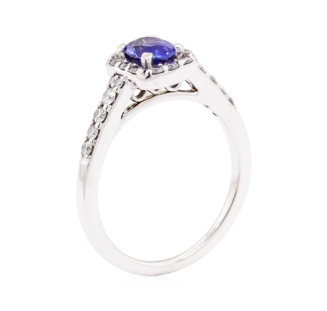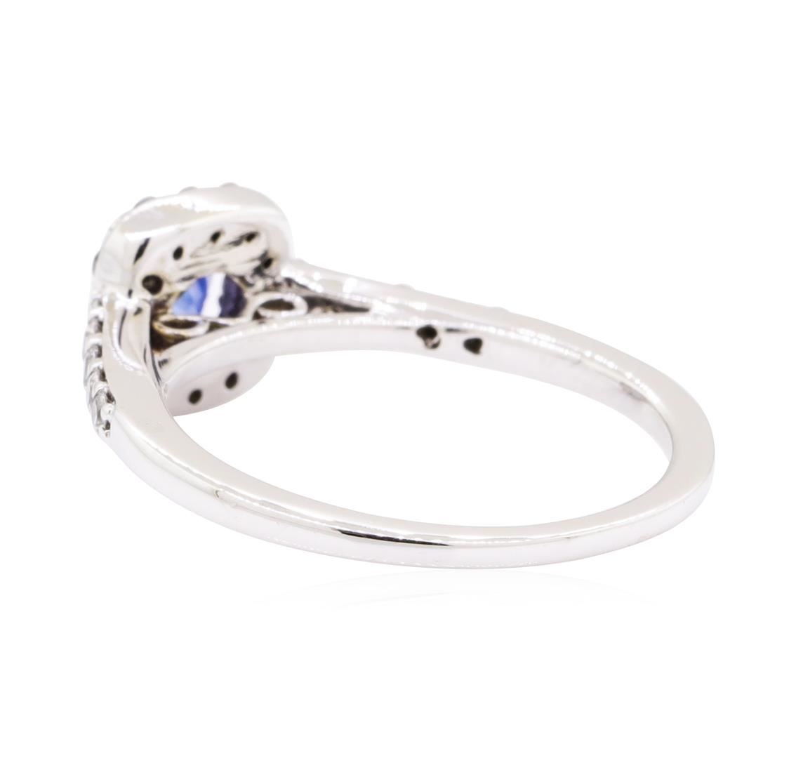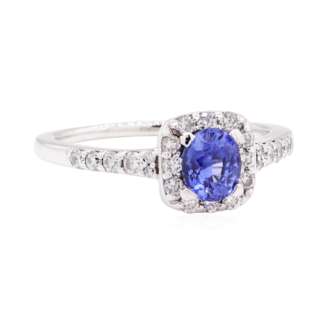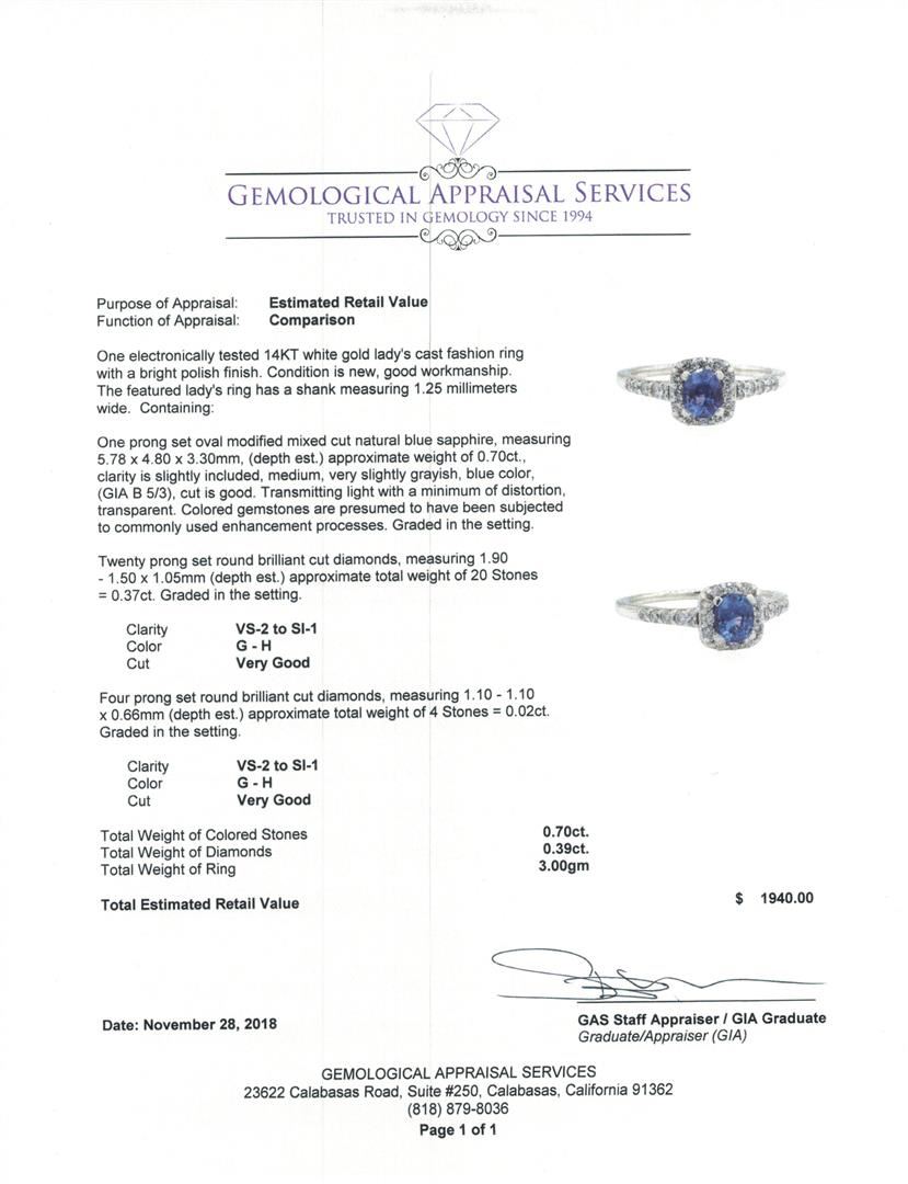 One electronically tested 14KT white gold lady's cast fashion ring with a bright polish finish. The featured lady's ring has a shank measuring 1.25 millimeters wide. Condition is new, good workmanship. Containing: One prong set oval modified mixed cut natural blue sapphire, measuring 5.78 x 4.80 x 3.30mm, (depth est.) approximate weight of 0.70ct., clarity is slightly included, medium, very slightly grayish, blue color, (GIA B 5/3), cut is good. Transmitting light with a minimum of distortion, transparent. Colored gemstones are presumed to have been subjected to commonly used enhancement processes. Graded in the setting. Twenty prong set round brilliant cut diamonds, measuring 1.90 - 1.50 x 1.05mm (depth est.) approximate total weight of 20 Stones = 0.37ct. Graded in the setting. Color G - H Clarity VS-2 to SI-1 Cut Very Good Four prong set round brilliant cut diamonds, measuring 1.10 - 1.10 x 0.66mm (depth est.) approximate total weight of 4 Stones = 0.02ct. Graded in the setting. Color G - H Clarity VS-2 to SI-1 Cut Very Good. Total Weight of Colored Stones 0.70ct.. Total Weight of Diamonds 0.39ct.. Total Weight of Ring 3.00gm GAS Appraised at $1940.00. GAS Appraised at $1,940.00.
