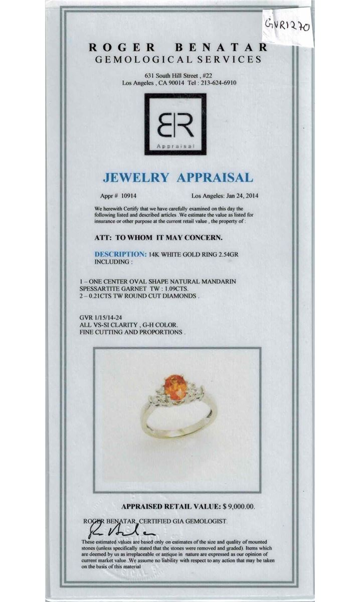 14K WHITE GOLD NATURAL SPESSARTITE RING :2.54GRAM /SPESSARTITE :1.09CT/ DIAMOND RD :0.21CT/#GVR1270