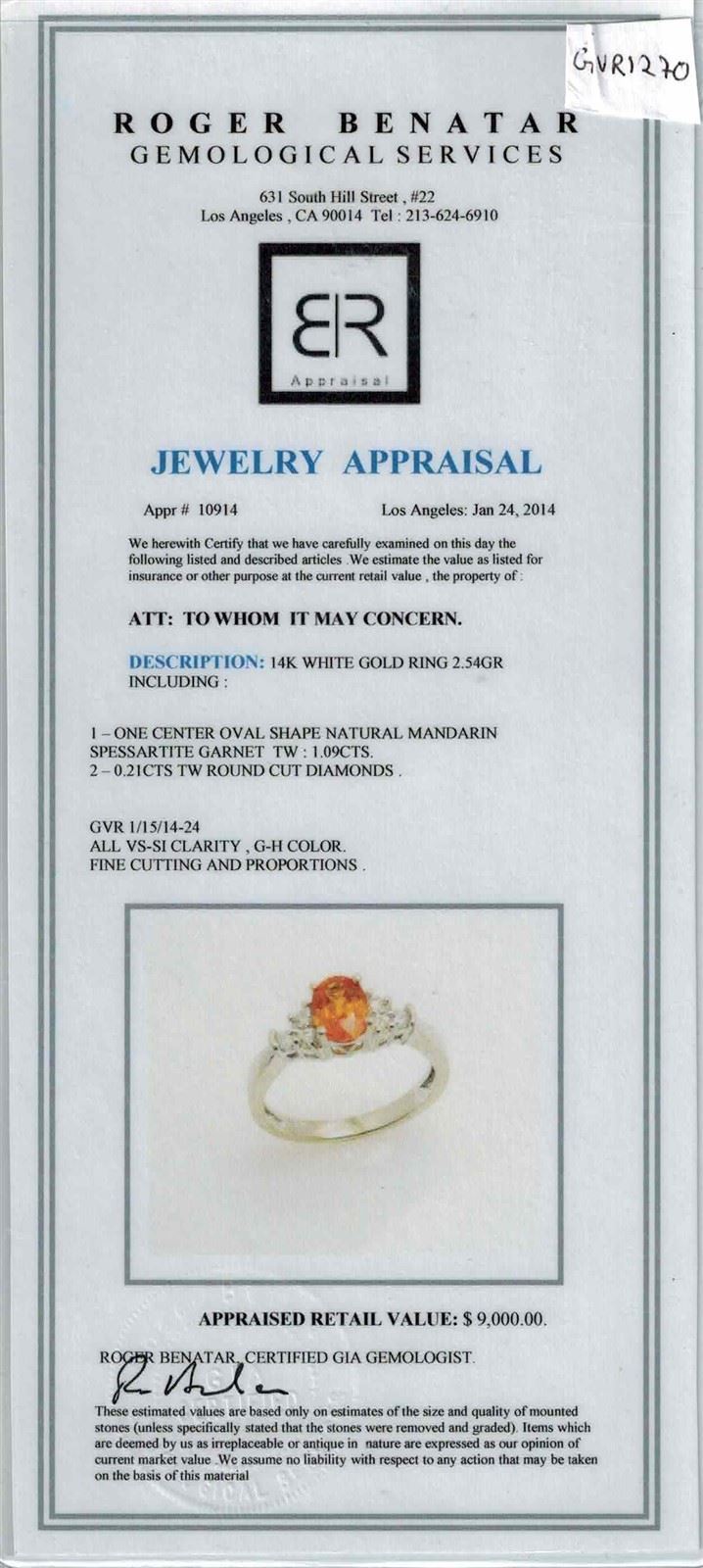 14K WHITE GOLD NATURAL SPESSARTITE RING :2.54GRAM /SPESSARTITE :1.09CT/ DIAMOND RD :0.21CT/#GVR1270 **Known for its powerful energy of creativity, sexuality and attraction, this bright and beaming 1.09ct oval shape natural Mandarin Spessartite Garnet glimmers brilliantly like the sun. Flanked with bursts of 0.21ct round cut Diamonds, this warmly crafted 14K white gold ring shines like a warm summer's day.**
