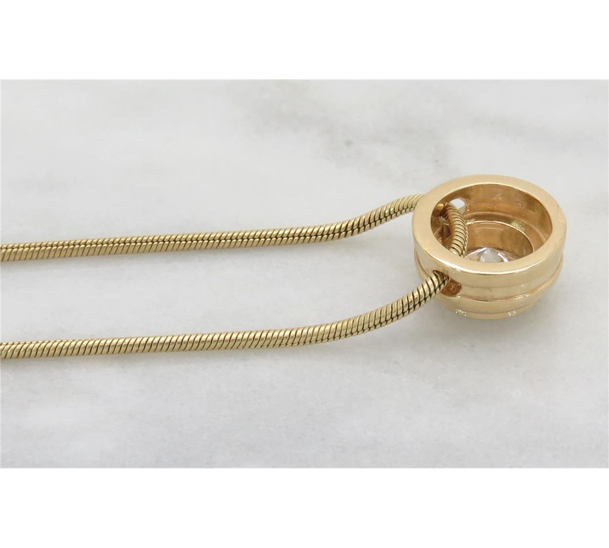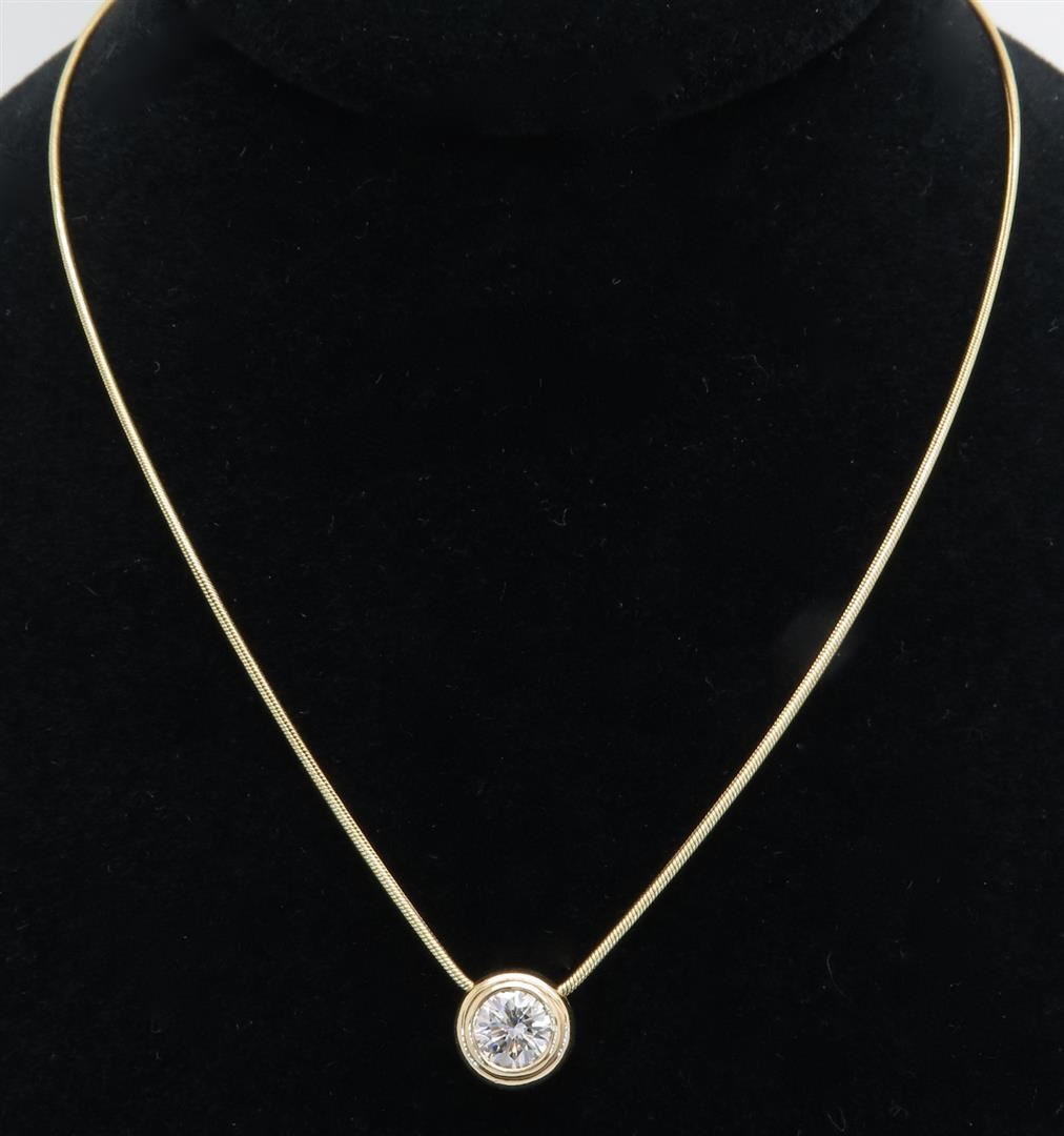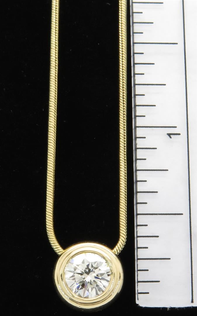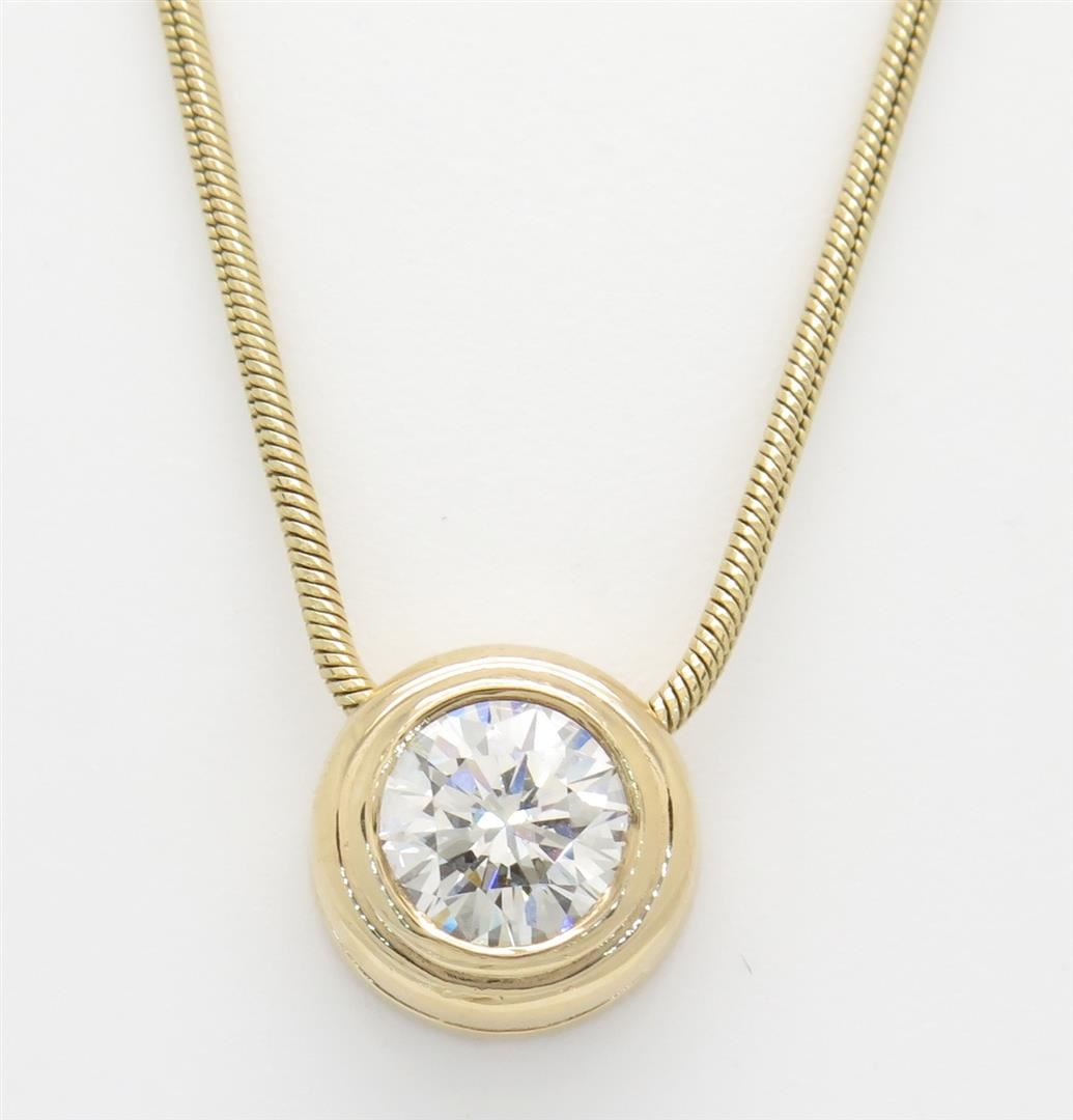 One tested 14K yellow gold diamond pendant. Containing: One Round Brilliant Cut Diamond. Approximate size: 1.09CT. Clarity: VS1, Color: F-G. Diamonds are graded in the mounting, unless otherwise stated. Weight: 7.8 grams, Size of chain: 18".