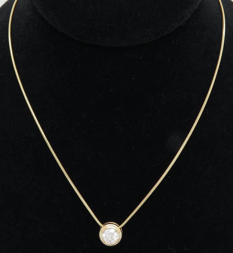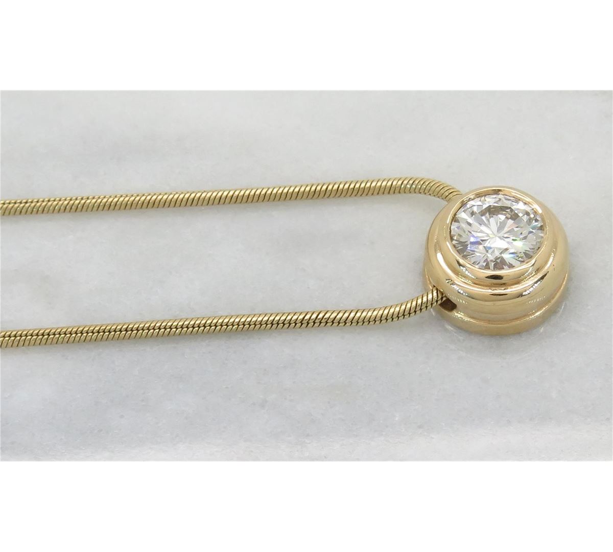 One tested 14K yellow gold diamond pendant. Containing: One Round Brilliant Cut Diamond. Approximate size: 1.09CT. Clarity: VS1, Color: F-G. Diamonds are graded in the mounting, unless otherwise stated. Weight: 7.8 grams, Size of chain: 18".