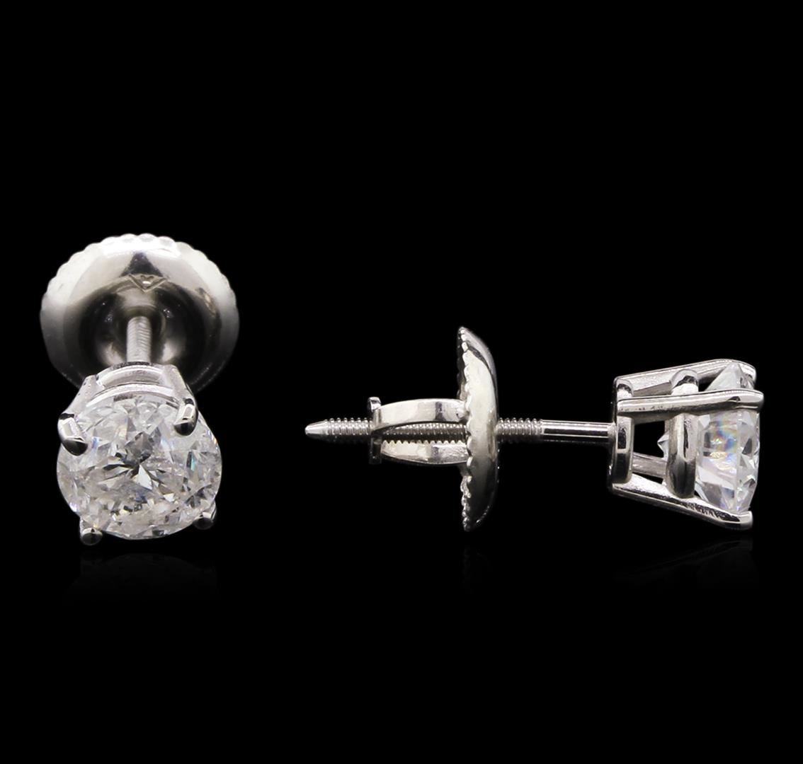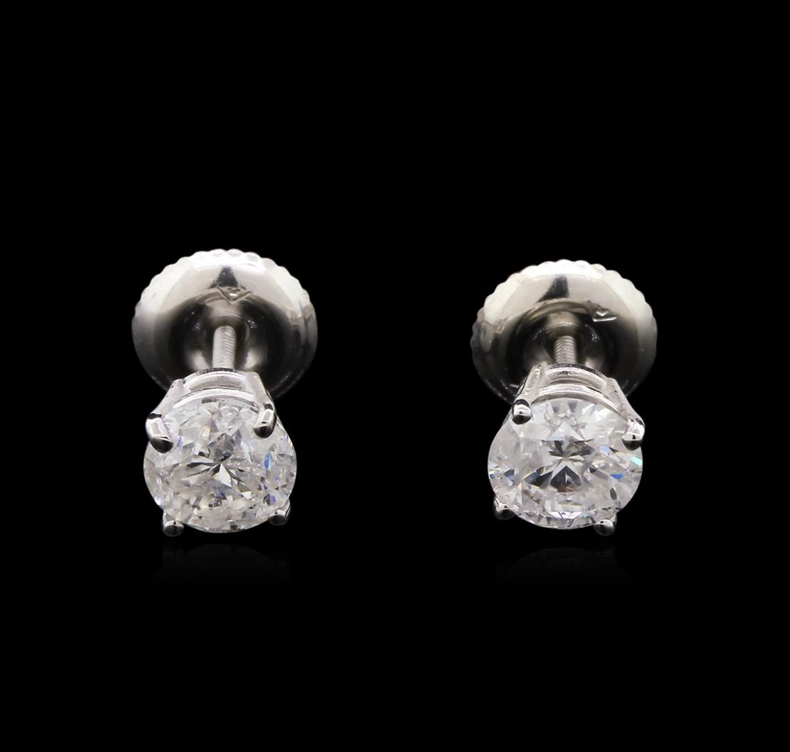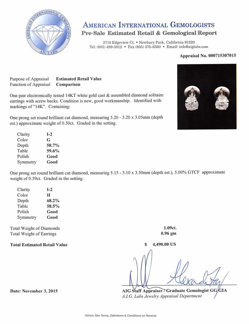 One pair electronically tested 14KT white gold cast & assembled diamond solitaire earrings with screw backs. Identified with markings of "14K". Condition is new, good workmanship. Containing: One prong set round brilliant cut diamond, measuring 5.20 - 5.20 x 3.05mm (depth est.) approximate weight of 0.50ct. Graded in the setting. Clarity: I-2. Color: 58.7%. Table 59.6%. One prong set round brilliant cut diamond, measuring 5.15 - 5.10 x 3.50mm (depth est.), 5.00% GTCF approximate weight of 0.59ct. Graded in the setting. Clarity: I-2. Color: 68.2%. Table 58.5%. Total Weight of Diamonds 1.09ct. Total Weight of Earrings 0.96gm. AIG Appraised at $4,490.00.