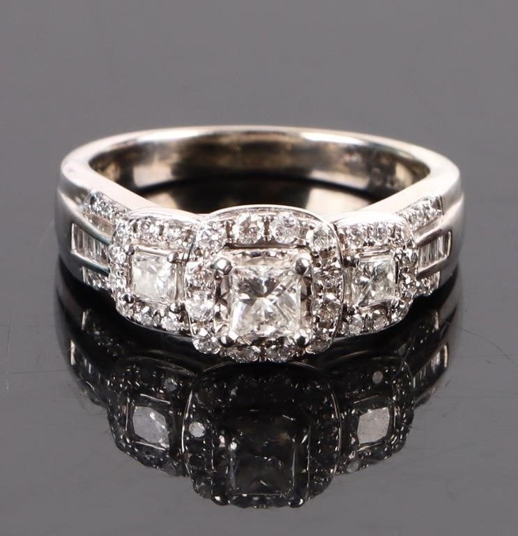 1.0CTW diamond 14k white gold ladies bridal ring with one 0.30ct princess-cut center diamond, two 0.10ct princess-cut diamonds, twelve 0.02ct round diamonds, twenty-eight 0.01ct round diamonds and ten 0.01ct channel diamonds.