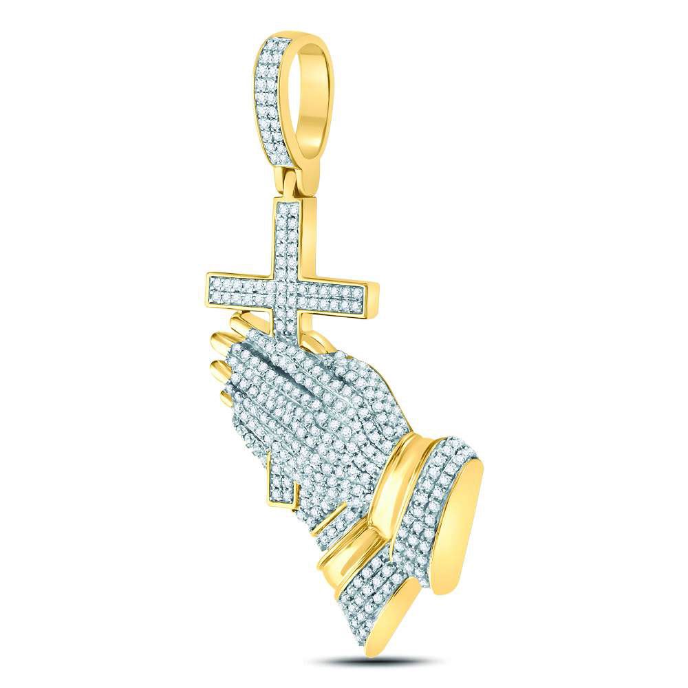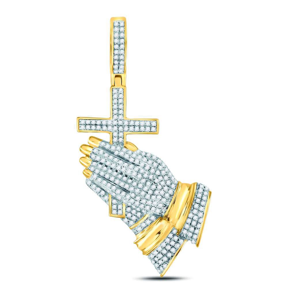 10kt Yellow Gold Mens Round Diamond Praying Hands Cross Charm Pendant 1-1/2 Cttw