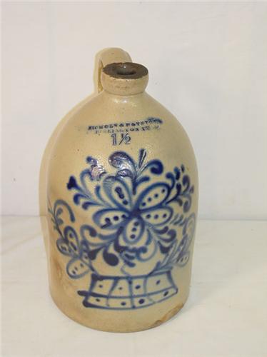 1 1/2 GAL. NICHOLS & BOYNTON BURLINGTON VT JUG W/ LARGE BRILLIANT BASKET OF FLOWERS DECORATION - SMALL CHIP TO BASE RIM