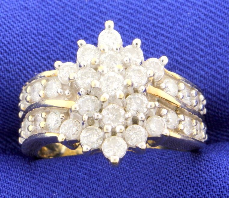 This cluster like 10k yellow gold band style ring sparkles with 1 1/2 carats of diamonds! The diamonds clarity is I1 and their colors include H-I-J. This ring sparkles and the diamonds face up very white! Size 8 7.8g