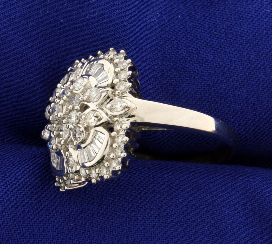 In 14k white gold this ring contains 1 1/2ct TW of high quality round and baguette diamonds ranging from .01 to .05 each. Diamonds are SI clarity/ G color      8.7g