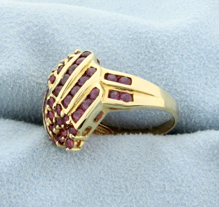 In 10K yellow gold, it contains fifty two 2mm round lab ruby gemstones with great red color. Size 6 1/4 4.4g
