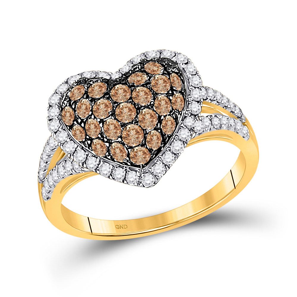 10kt Yellow Gold Womens Round Brown Diamond Heart Ring 1-3/8 Cttw