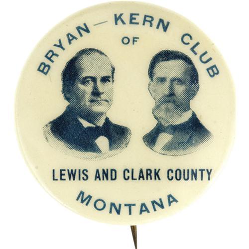 <B>Rare 1 1/4" 1908 Bryan & Kern Jugate Button from Montana.</B></I> This distinctive blue/cream design is considered one of the best Bryan & Kern jugates. It is especially nice as it emanates from a sparsely populated state which produced few presidential campaign button varieties. Probably not more than a half-dozen copies are known. Choice condition. <I>From the Norman Loewenstern Collection.</B></I>