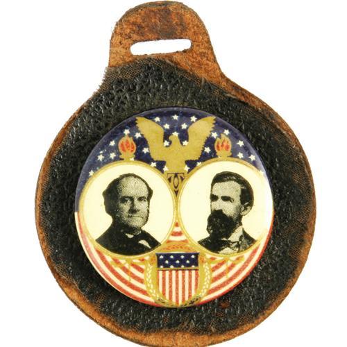 <B>A Fine, Multicolor 1 1/4" Bryan & Kern Jugate on a Watch Fob.</B></I> A beautiful design which was used in several different elections, as late as a Hoover & Curtis version in 1928. The leather fob exhibits some wear, but the button is in excellent condition but for one miniscule celluloid crack in the field, visible only under magnification and noted strictly for accuracy. <I>From the Norman Loewenstern Collection</B></I>.
