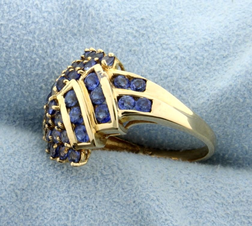 In 10K yellow gold this ring contains forty 2mm round lab tanzanite gemstones that are approximately 1ct total weight with great purple color. Size 7 1/4 4.5g