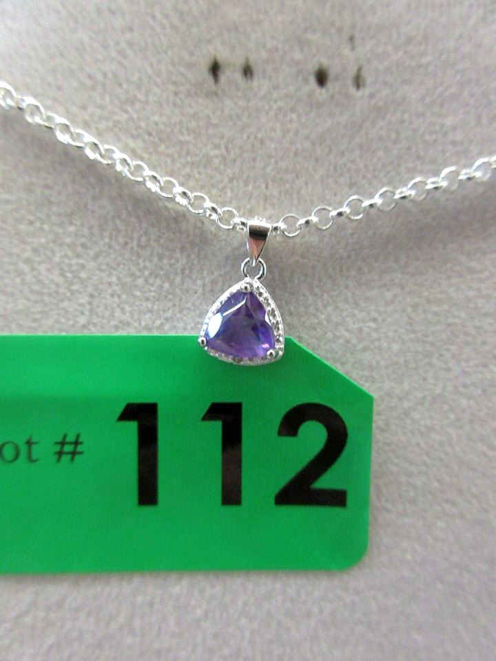 7 x 7 mm Trillion cut amethyst & 2 diamonds. Sterling silver. $300 certificate.