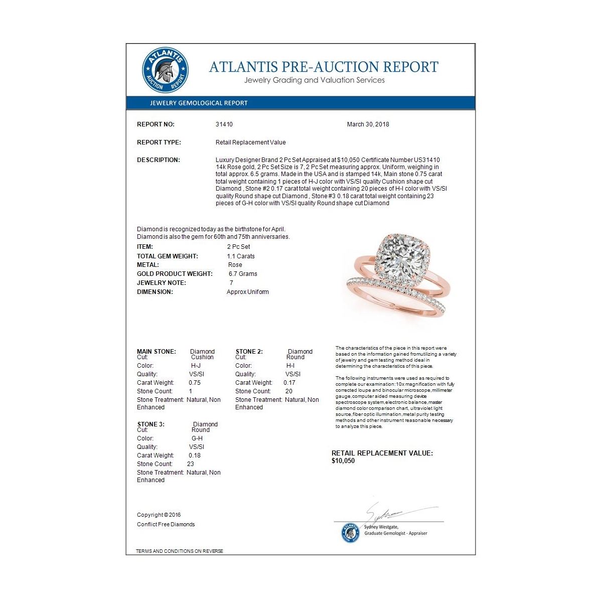REF-228W9F -31410 ---- 1.1 CTW Certified VS/SI Cushion Diamond 2Pc Set Solitaire Halo 14K Rose Gold ---- Luxury Designer Brand 2 Pc Set Appraised at $10,050 Certificate Number US31410 14k Rose gold, 2 Pc Set Size is 7, 2 Pc Set measuring approx. Uniform, weighing in total approx. 6.5 grams. Made in the USA and is stamped 14k, Main stone 0.75 carat total weight containing 1 pieces of H-J color with VS/SI quality Cushion shape cut Diamond , Stone #2 0.17 carat total weight containing 20 pieces of H-I color with VS/SI quality Round shape cut Diamond , Stone #3 0.18 carat total weight containing 23 pieces of G-H color with VS/SI quality Round shape cut Diamond
