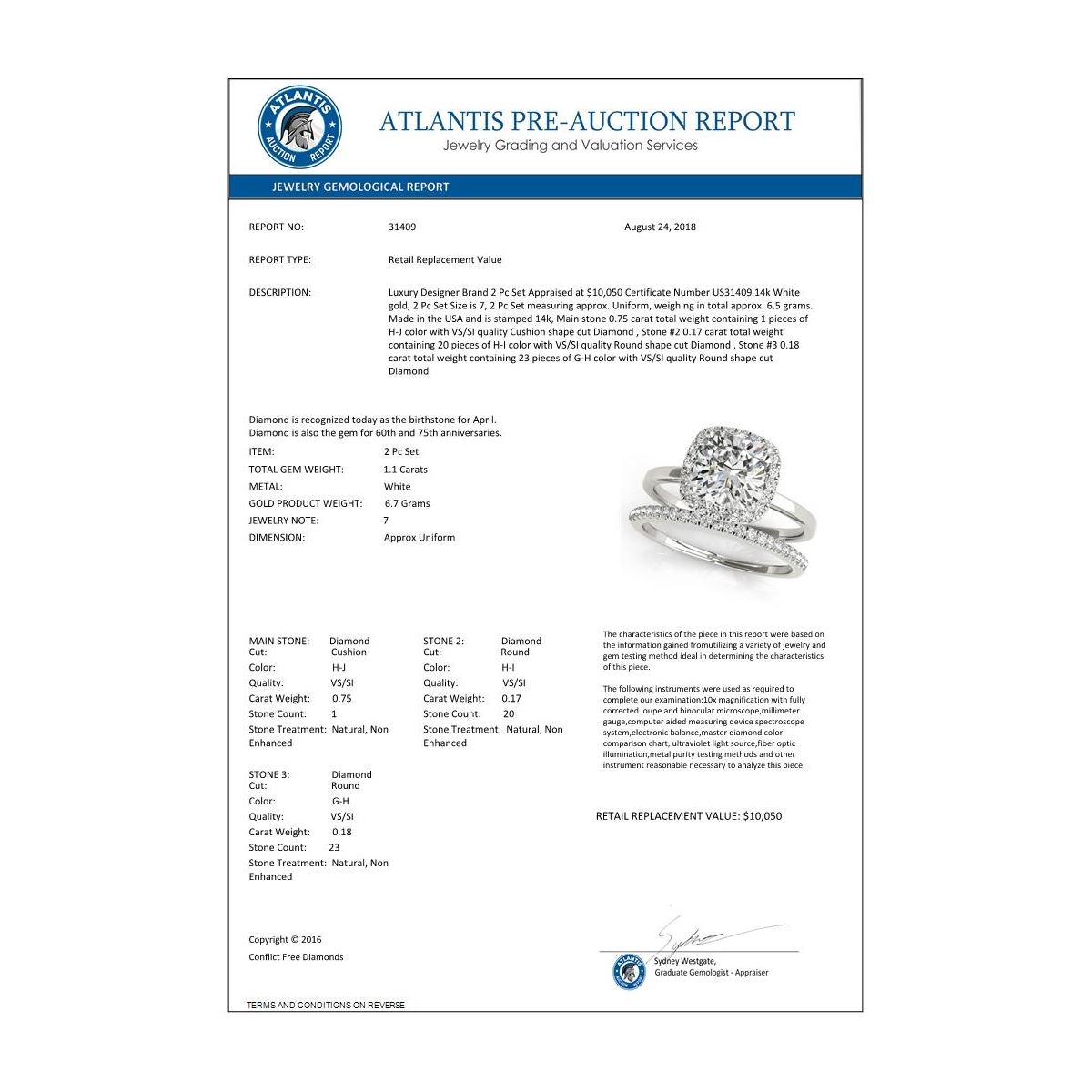 REF-228H9A -31409 ---- 1.1 CTW Certified VS/SI Cushion Diamond 2Pc Set Solitaire Halo 14K White Gold ---- Luxury Designer Brand 2 Pc Set Appraised at $10,050 Certificate Number US31409 14k White gold, 2 Pc Set Size is 7, 2 Pc Set measuring approx. Uniform, weighing in total approx. 6.5 grams. Made in the USA and is stamped 14k, Main stone 0.75 carat total weight containing 1 pieces of H-J color with VS/SI quality Cushion shape cut Diamond , Stone #2 0.17 carat total weight containing 20 pieces of H-I color with VS/SI quality Round shape cut Diamond , Stone #3 0.18 carat total weight containing 23 pieces of G-H color with VS/SI quality Round shape cut Diamond