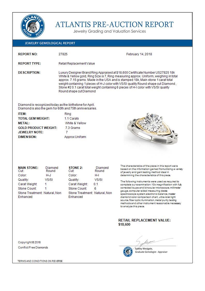 REF-309W8F -27825 ---- 1.1 CTW Certified VS/SI Diamond Solitaire Ring 18K White & Yellow Gold ---- Luxury Designer Brand Ring Appraised at $18,600 Certificate Number US27825 18k White & Yellow gold, Ring Size is 7, Ring measuring approx. Uniform, weighing in total approx. 7.15 grams. Made in the USA and is stamped 18k, Main stone 1 carat total weight containing 1 pieces of H-J color with VS/SI quality Round shape cut Diamond , Stone #2 0.1 carat total weight containing 6 pieces of H-I color with VS/SI quality Round shape cut Diamond