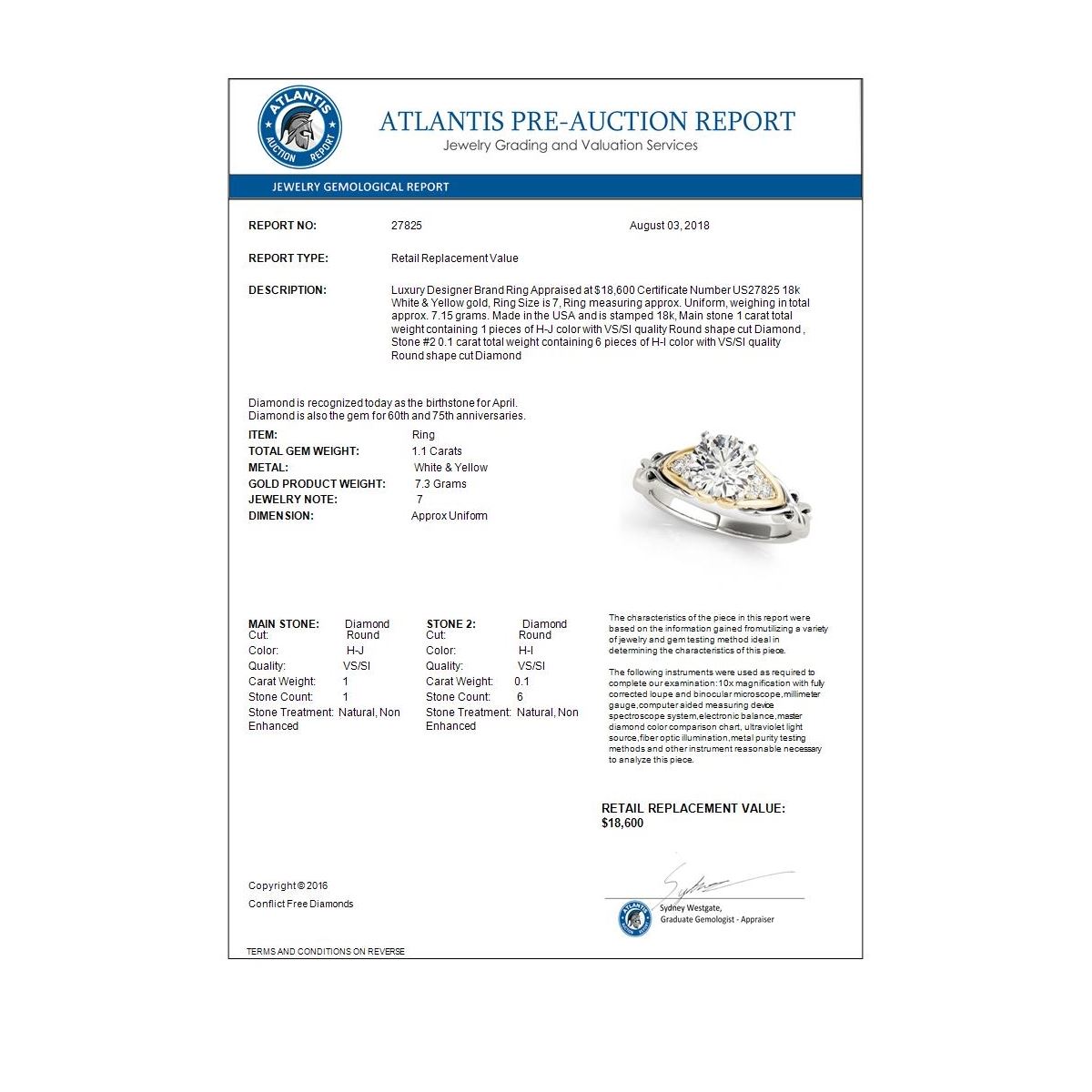 REF-309W8F -27825 ---- 1.1 CTW Certified VS/SI Diamond Solitaire Ring 18K White & Yellow Gold ---- Luxury Designer Brand Ring Appraised at $18,600 Certificate Number US27825 18k White & Yellow gold, Ring Size is 7, Ring measuring approx. Uniform, weighing in total approx. 7.15 grams. Made in the USA and is stamped 18k, Main stone 1 carat total weight containing 1 pieces of H-J color with VS/SI quality Round shape cut Diamond , Stone #2 0.1 carat total weight containing 6 pieces of H-I color with VS/SI quality Round shape cut Diamond
