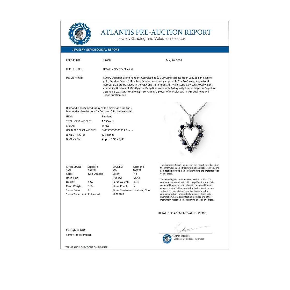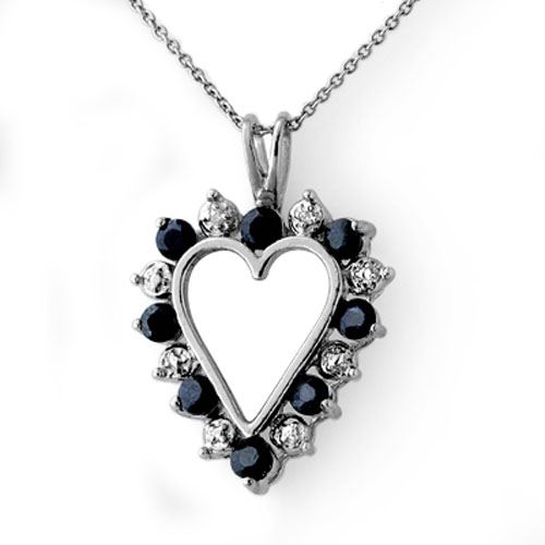 REF-21H6A -12658 ---- 1.10 CTW Blue Sapphire & Diamond Pendant 14K White Gold ---- Luxury Designer Brand Pendant Appraised at $1,300 Certificate Number US12658 14k White gold, Pendant Size is 3/4 Inches, Pendant measuring approx. 1/2" x 3/4", weighing in total approx. 3.25 grams. Made in the USA and is stamped 14k, Main stone 1.07 carat total weight containing 8 pieces of Mid-Opaque-Deep Blue color with AAA quality Round shape cut Sapphire , Stone #2 0.03 carat total weight containing 2 pieces of H-I color with VS/SI quality Round shape cut Diamond