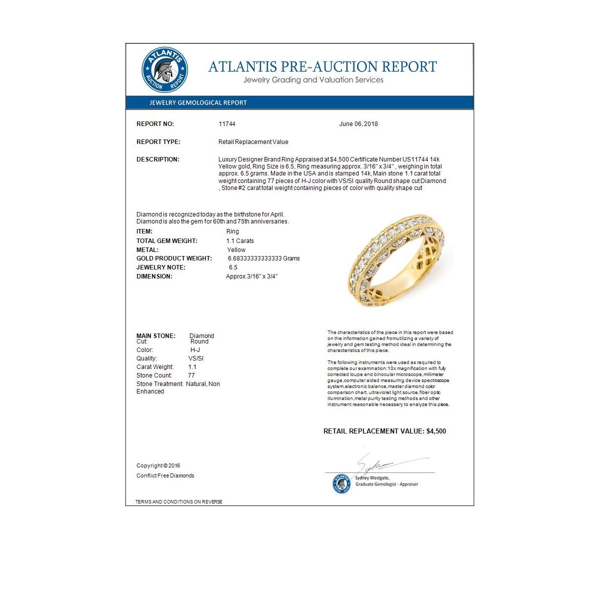 REF-102A8X -11744 ---- 1.10 CTW Certified VS/SI Diamond Band 14K Yellow Gold ---- Luxury Designer Brand Ring Appraised at $4,500 Certificate Number US11744 14k Yellow gold, Ring Size is 6.5, Ring measuring approx. 3/16" x 3/4" , weighing in total approx. 6.5 grams. Made in the USA and is stamped 14k, Main stone 1.1 carat total weight containing 77 pieces of H-J color with VS/SI quality Round shape cut Diamond , Stone #2 carat total weight containing pieces of color with quality shape cut