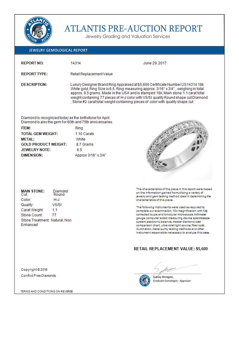1.10 CTW Certified VS/SI Diamond Band 18K White Gold ---- Luxury Designer Brand Ring Appraised Retail Price at $5,600 ---- SKU Number US14314 18k White gold Ring Size is 6.5, Ring measuring approx. 3/16" x 3/4" , weighing in total approx. 8.5 grams. Made in the USA and is stamped 18k, Main stone 1.1 carat total weight containing 77 pieces of H-J color with VS/SI quality Round shape cut Diamond , Stone #2 carat total weight containing pieces of color with quality shape cut