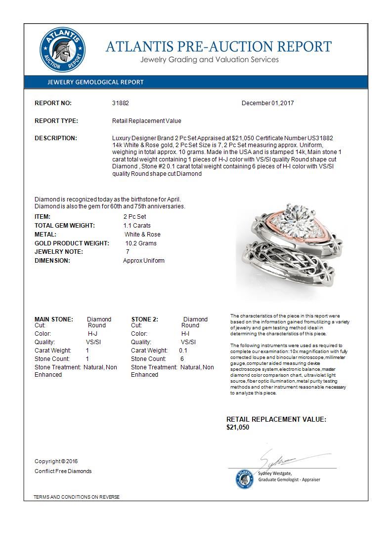 31882 - REF-382N7A ---- 1.10 CTW Certified VS/SI Diamond Solitaire 2Pc Set 14K White & Rose Gold ---- Luxury Designer Brand 2 Pc Set Appraised at $21,050 Certificate Number US31882 14k White & Rose gold, 2 Pc Set Size is 7, 2 Pc Set measuring approx. Uniform, weighing in total approx. 10 grams. Made in the USA and is stamped 14k, Main stone 1 carat total weight containing 1 pieces of H-J color with VS/SI quality Round shape cut Diamond , Stone #2 0.1 carat total weight containing 6 pieces of H-I color with VS/SI quality Round shape cut Diamond