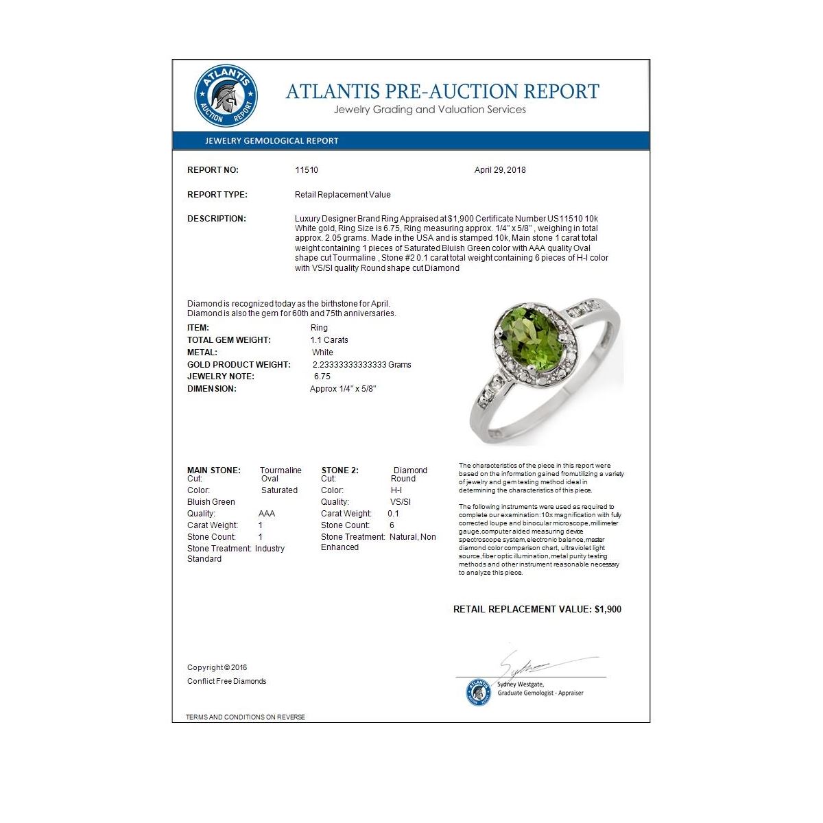 REF-24N4Y -11510 ---- 1.10 CTW Green Tourmaline & Diamond Ring 10K White Gold ---- Luxury Designer Brand Ring Appraised at $1,900 Certificate Number US11510 10k White gold, Ring Size is 6.75, Ring measuring approx. 1/4" x 5/8" , weighing in total approx. 2.05 grams. Made in the USA and is stamped 10k, Main stone 1 carat total weight containing 1 pieces of Saturated Bluish Green color with AAA quality Oval shape cut Tourmaline , Stone #2 0.1 carat total weight containing 6 pieces of H-I color with VS/SI quality Round shape cut Diamond