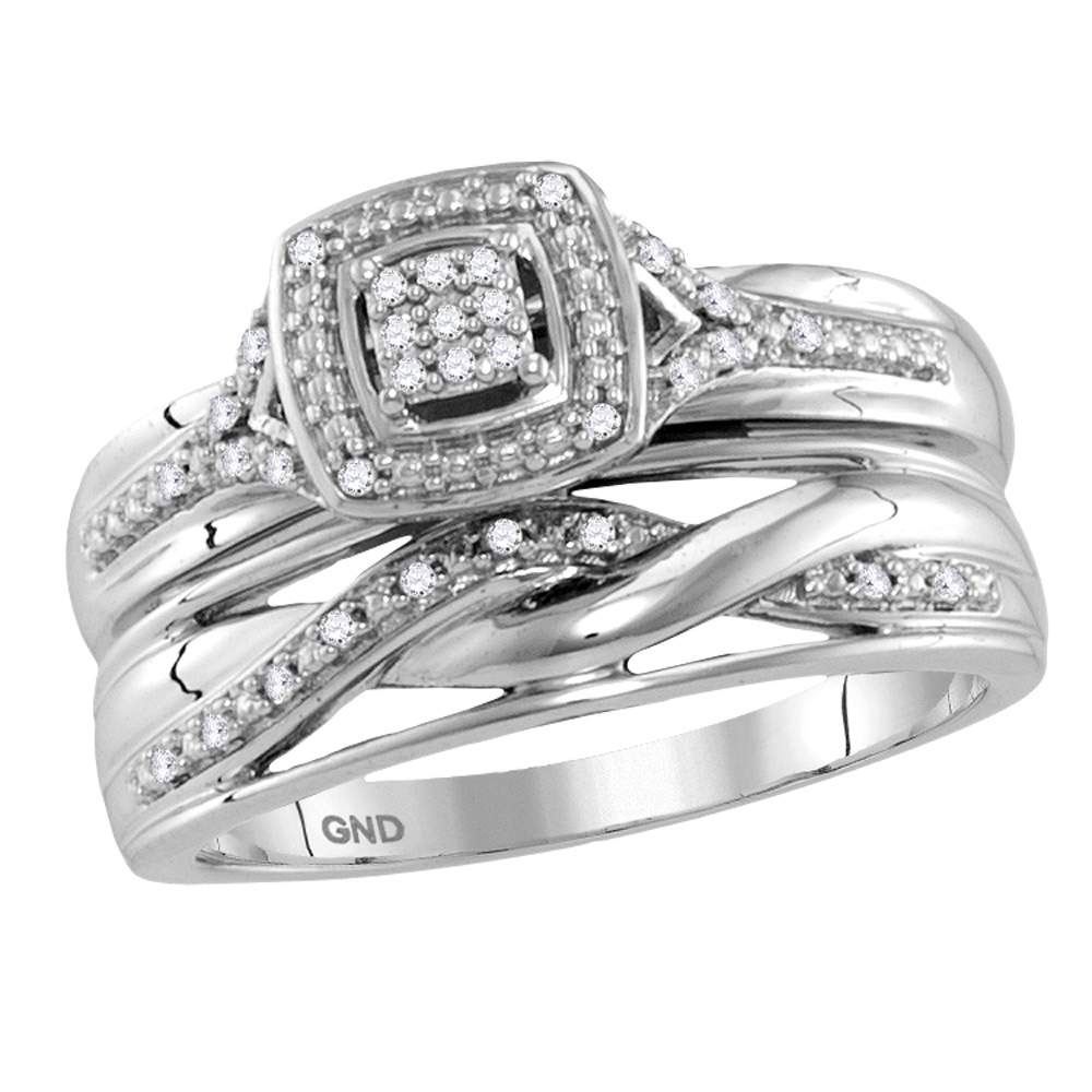 10kt White Gold His & Hers Round Diamond Cluster Matching Bridal Wedding Ring Band Set 1/10 Cttw