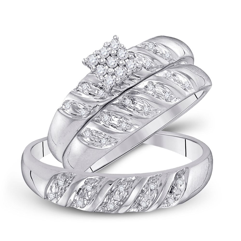 14kt White Gold His & Hers Round Diamond Cluster Matching Bridal Wedding Ring Band Set 1/10 Cttw