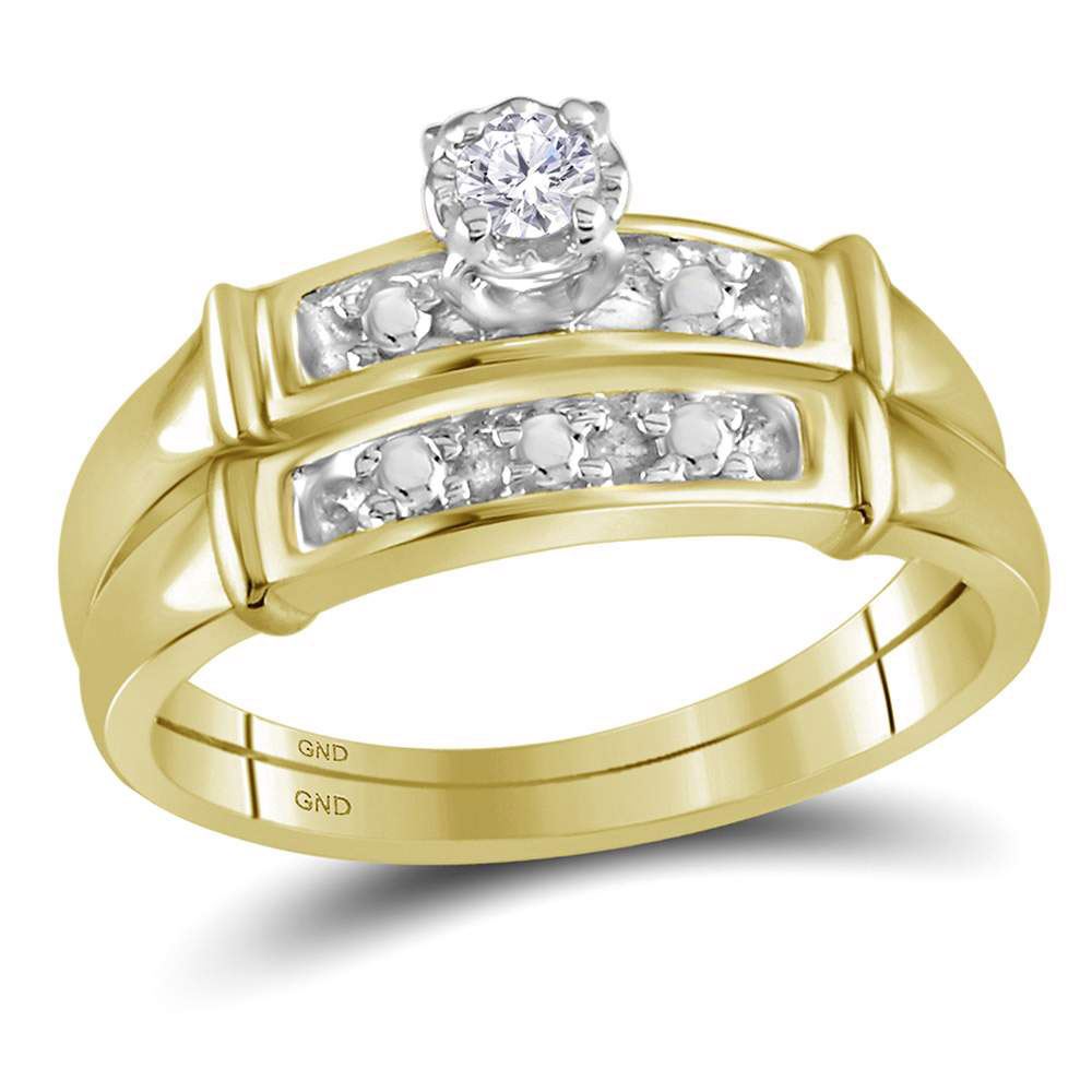 14kt Yellow Gold His & Hers Round Diamond Solitaire Matching Bridal Wedding Ring Band Set 1/10 Cttw