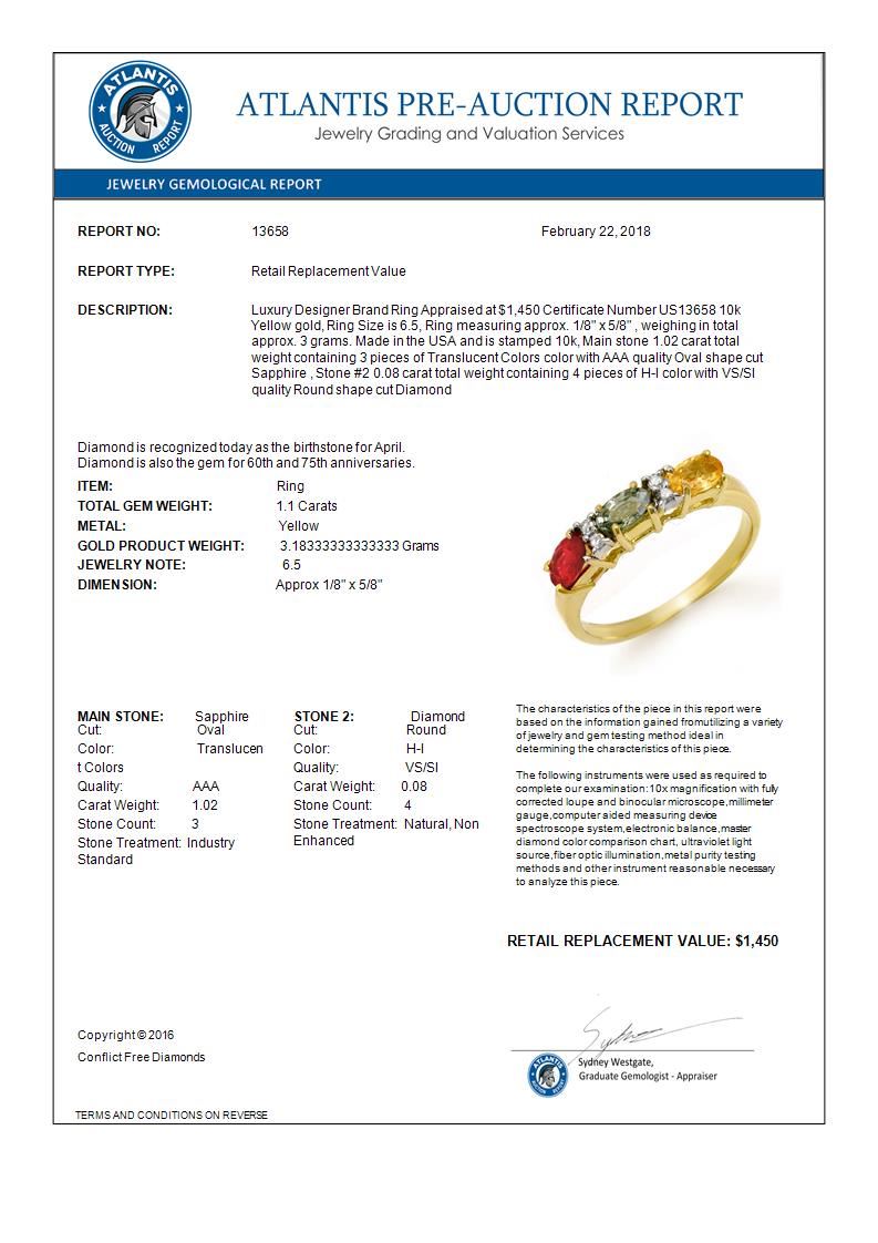 REF-22F2N -13658 ---- 1.10 CTW Multi-Sapphire & Diamond Ring 10K Yellow Gold ---- Luxury Designer Brand Ring Appraised at $1,450 Certificate Number US13658 10k Yellow gold, Ring Size is 6.5, Ring measuring approx. 1/8" x 5/8" , weighing in total approx. 3 grams. Made in the USA and is stamped 10k, Main stone 1.02 carat total weight containing 3 pieces of Translucent Colors color with AAA quality Oval shape cut Sapphire , Stone #2 0.08 carat total weight containing 4 pieces of H-I color with VS/SI quality Round shape cut Diamond